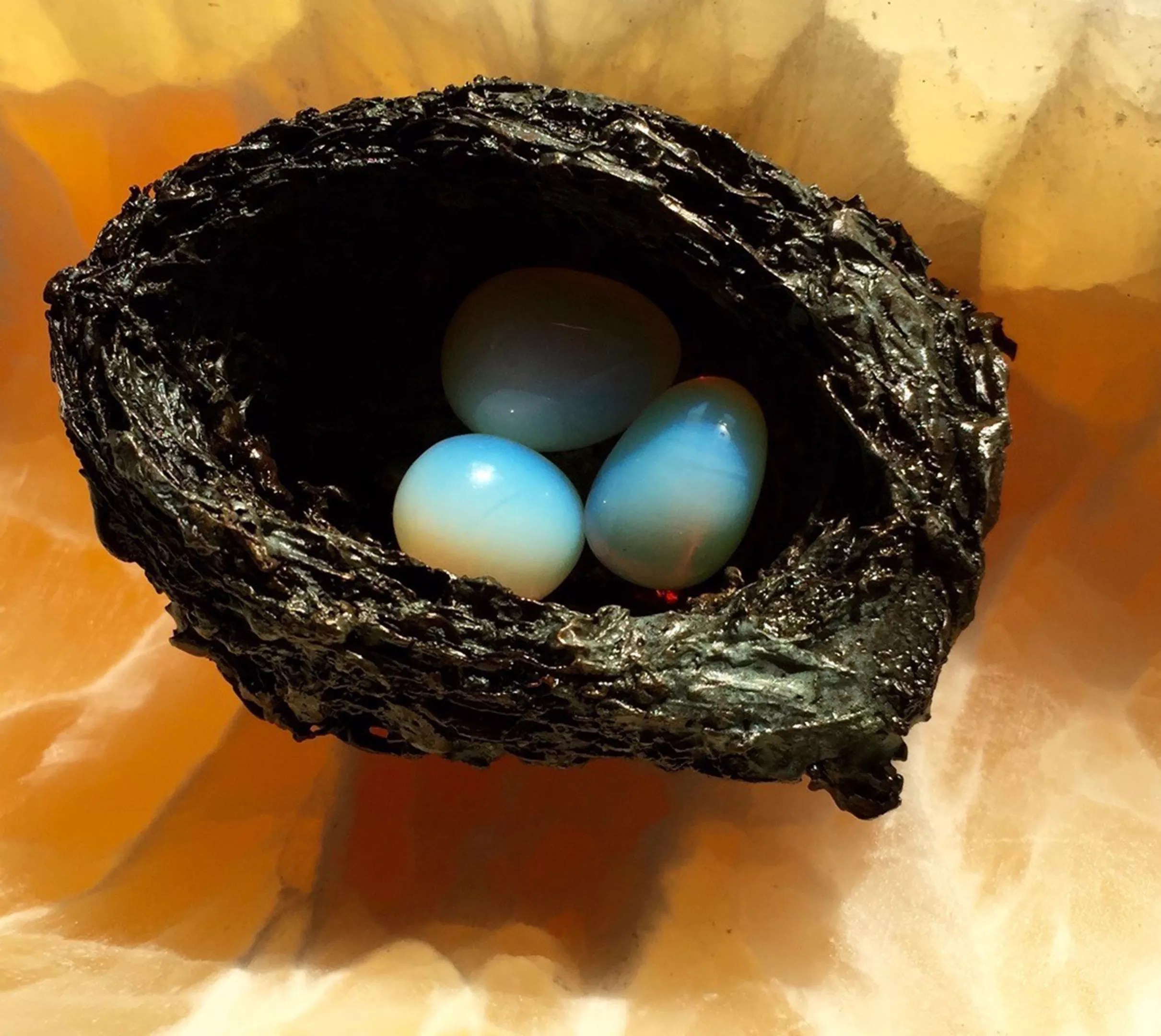 Some pieces on display include Season of Silence (two bronze sunflowers), Sheltered (a bronze nest occupied by opalite stone eggs), and Petals of Still Lilies (six panels of silk hanging).