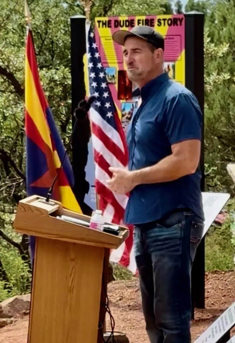 Filmmaker Scott Briggs addresses the crowd at the Dude Fire memorial in Bonita Creek, Arizona.