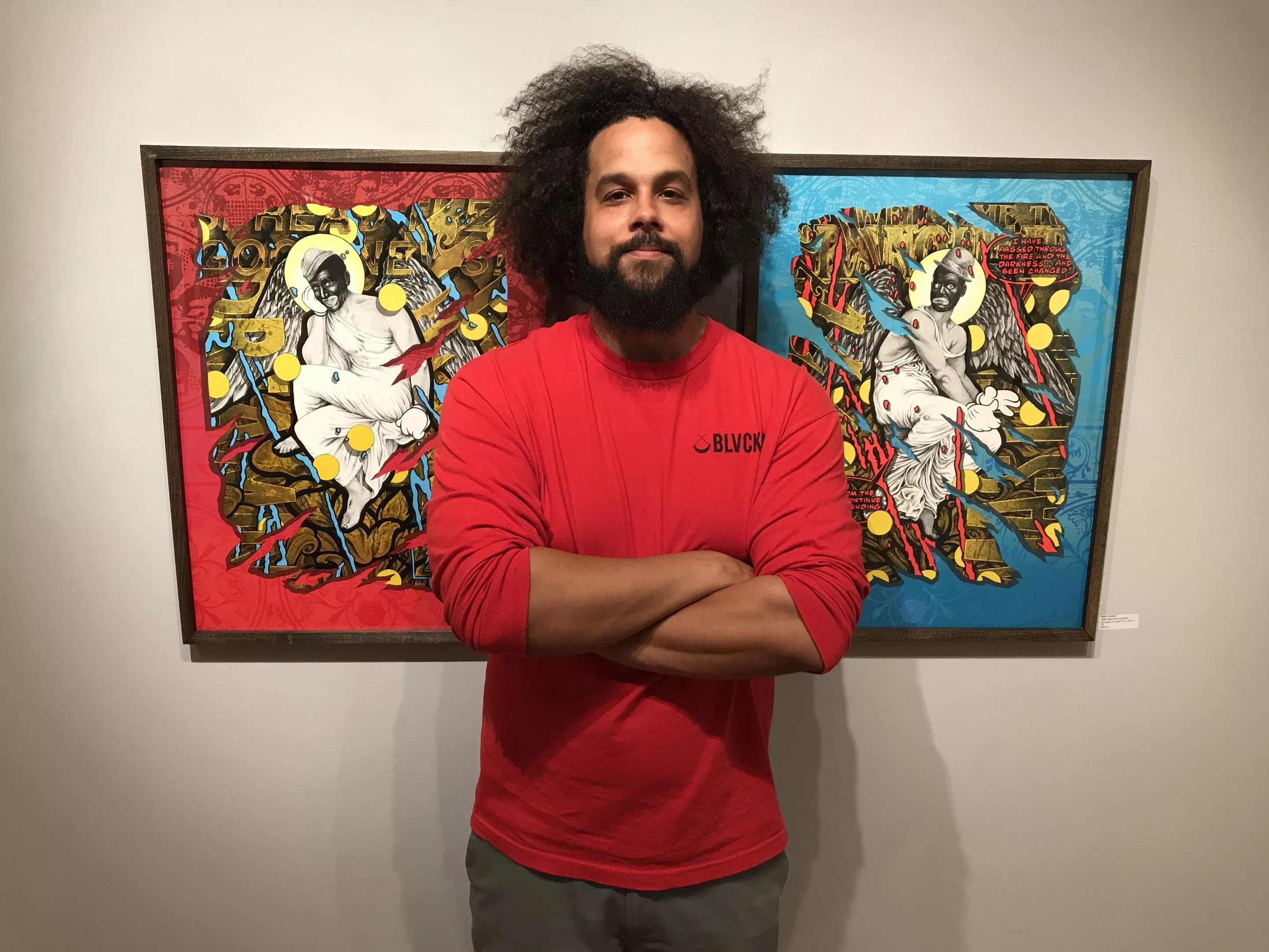 Phoenix native Antoinette Cauley specializes in portraits that reference rap music and hip-hop culture while addressing both social issues and her own “internal conflicts.” Her paintings have been exhibited by Artlink, monOrchid, West Valley Arts HQ, and others. In addition to her art practice, Cauley spends time teaching youth art classes. Artist Aaron Coleman with works he exhibited at Modified Arts, Lynn Trimble