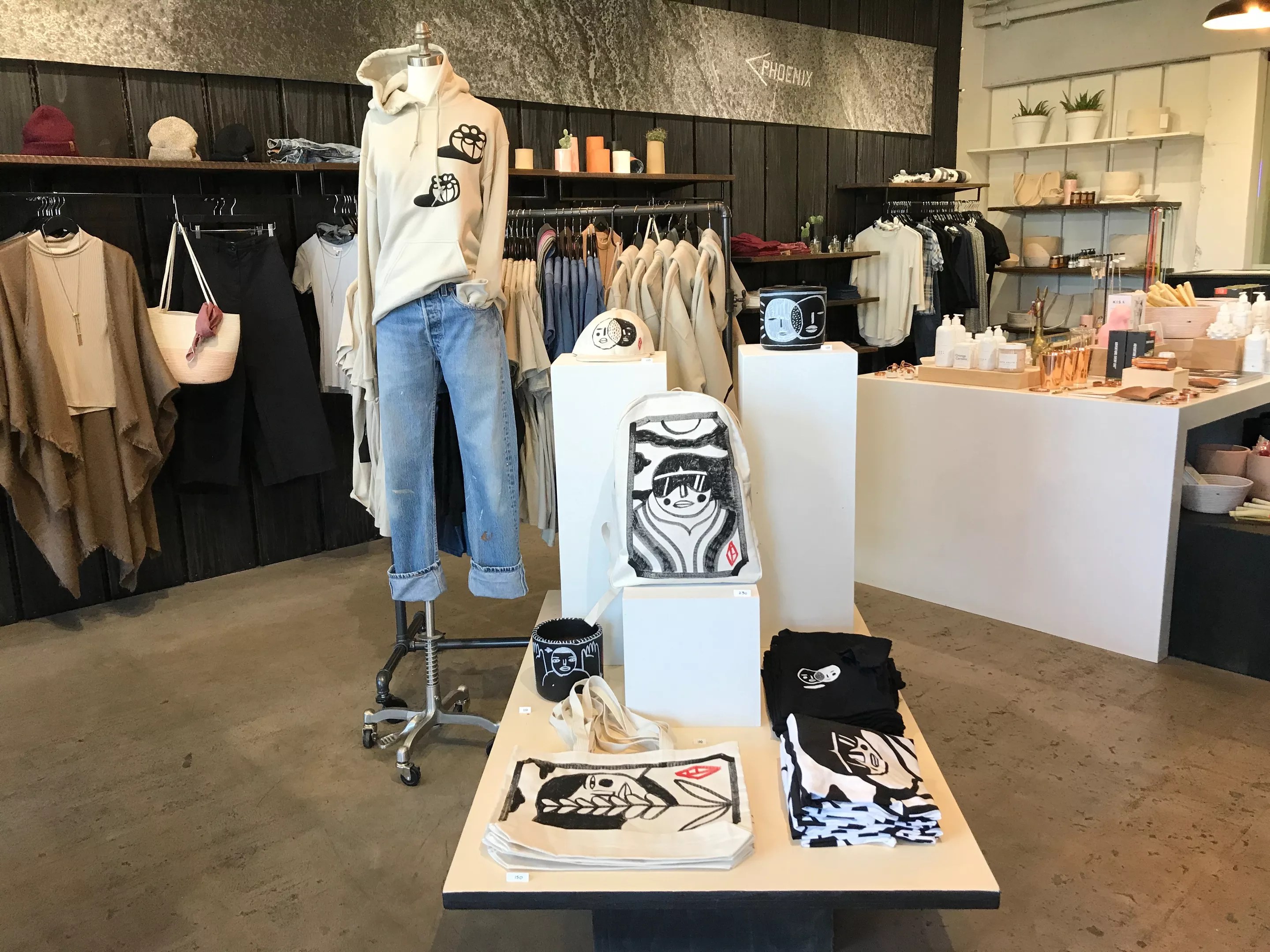 Last December, Phoenix General collaborated with the Fortoul Brothers for “Total Eclipse,” which included 100 small drawings exhibited in the Shortcut Gallery space the boutique shares with Framed Ewe, plus T-shirts and hoodies with two hand-painted designs. It also featured a small number of items, such as backpacks and planters, with hand-drawn artwork.