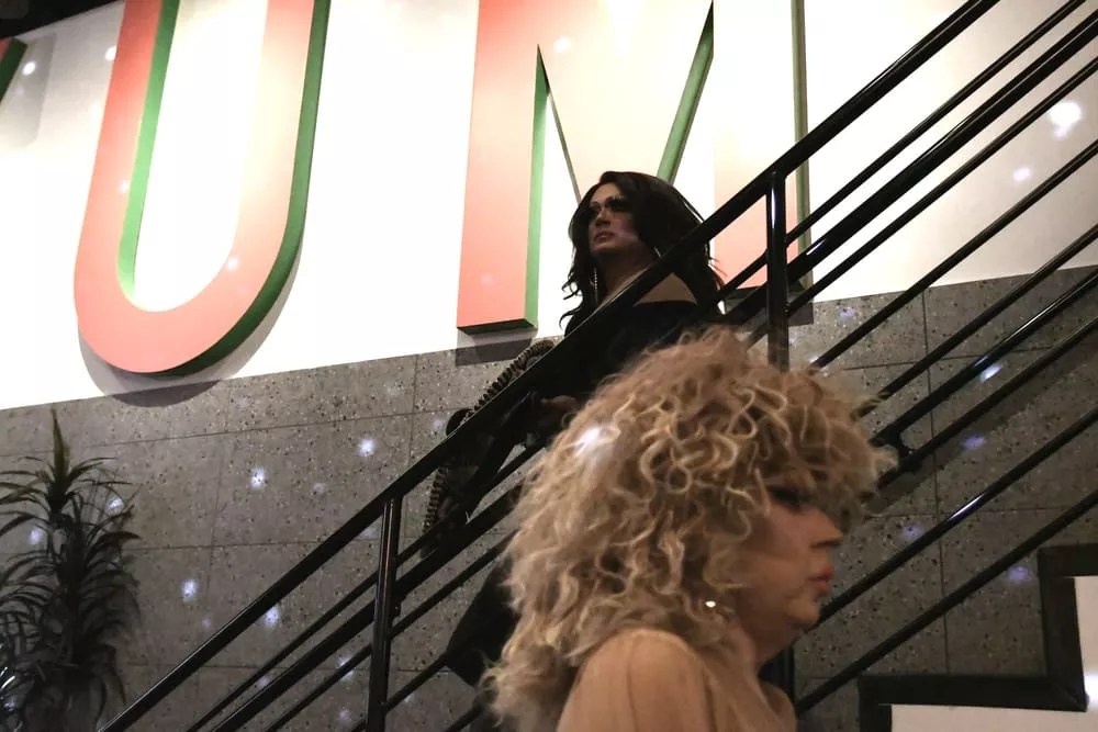A performer walks down the steps of YUMBAR and prepares to lip sync a song by Selena during a Friday late night drag show.