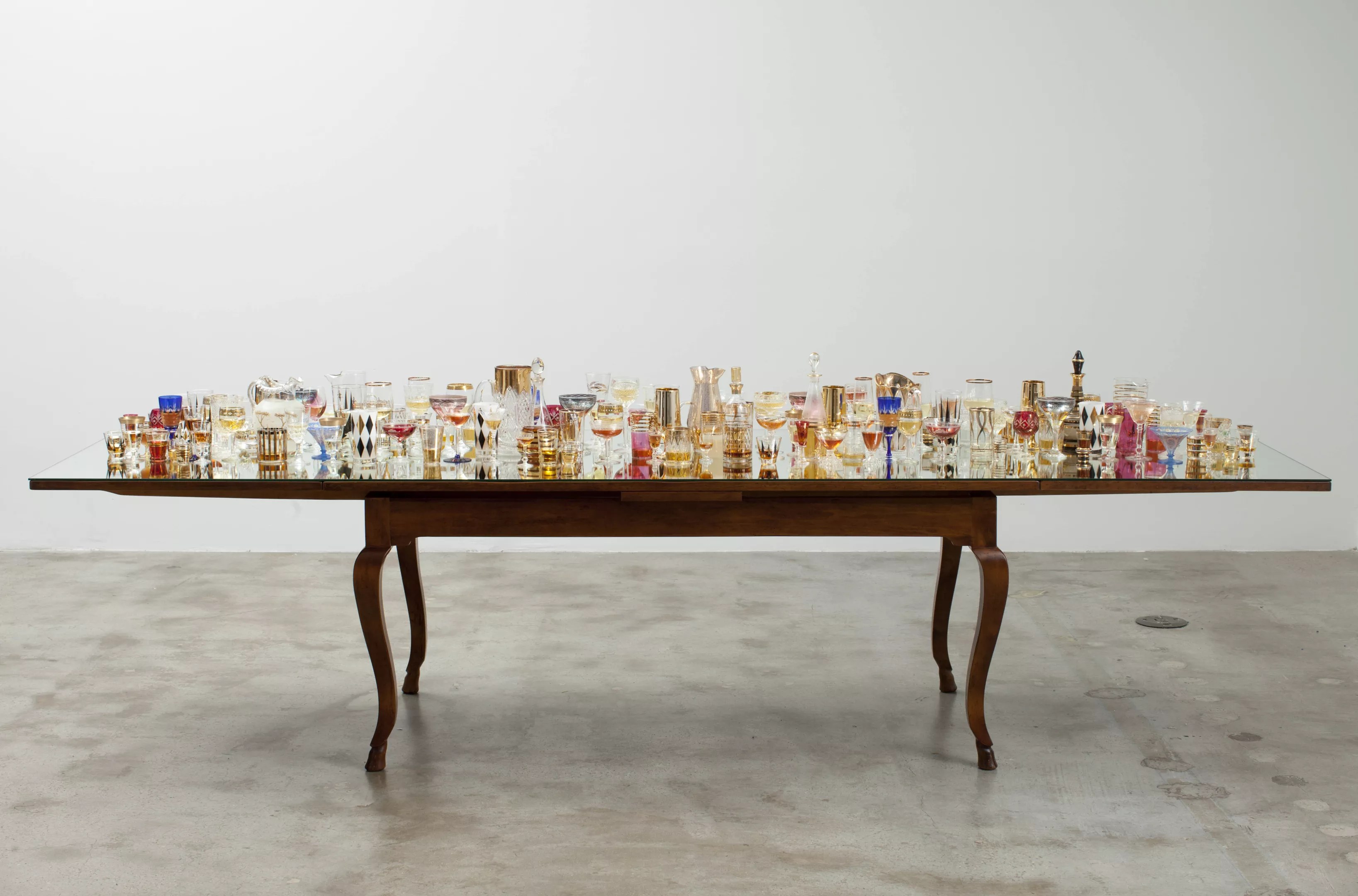 Finale, Valeska Soares, 2013. Antique table, 151 antique glasses, 5 pitchers, 3 decanters, liquor and mirror. The Ella Fontanals-Cisneros Collection, Miami.