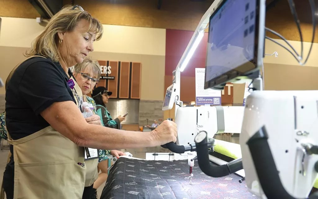 Leigh Zipf demonstrates how to use a longarm quilting machine at the Handi Quilter booth at QuiltCon.