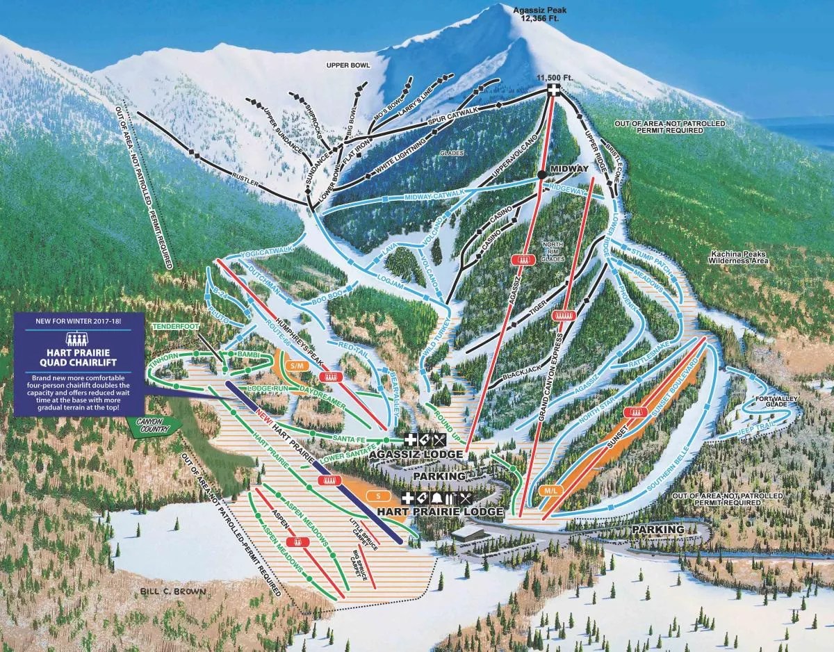 The Hart Prairie area also features the Aspen chairlift and two surface conveyors, making it an ideal spot for ski and snowboard students.