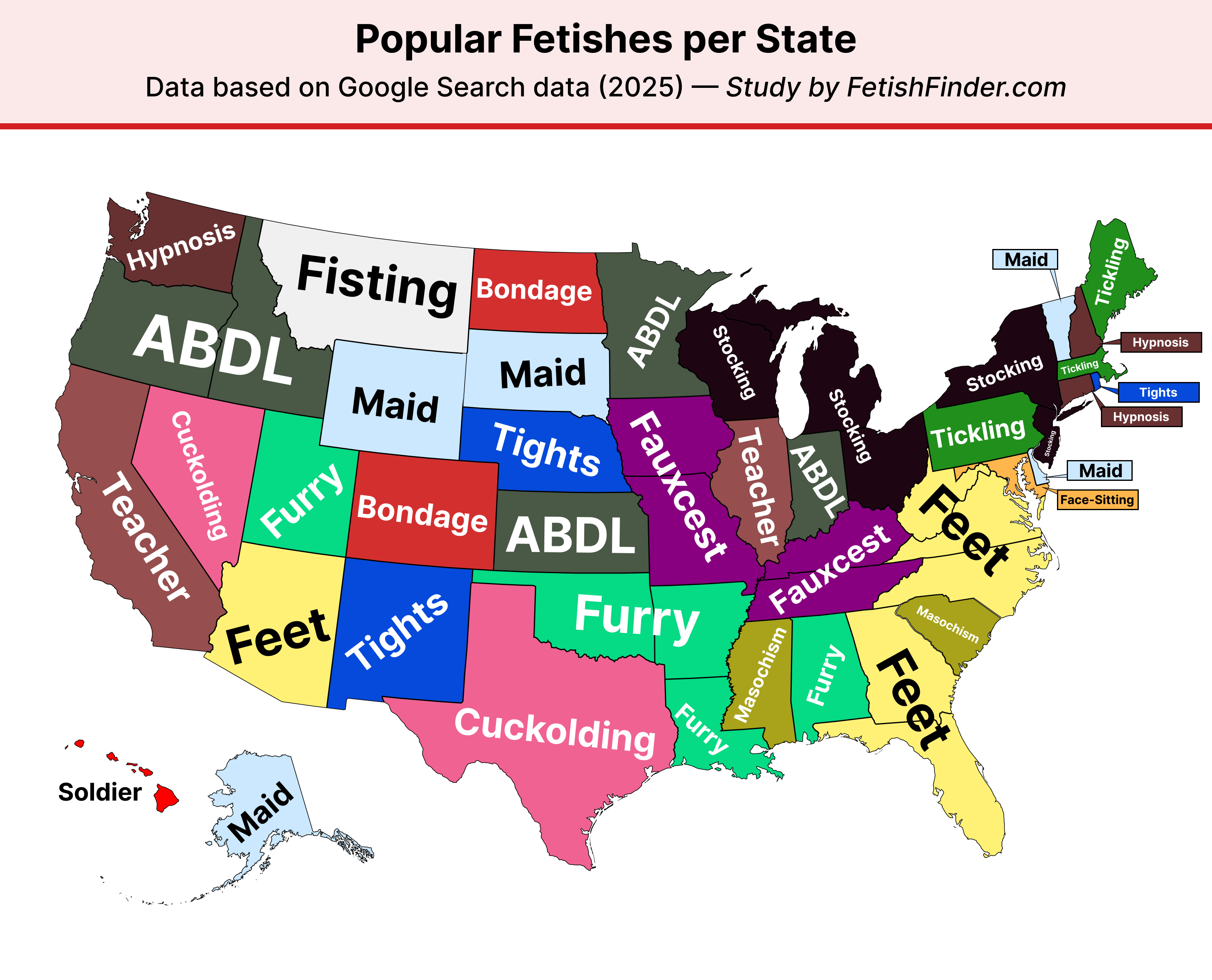 The study from FetishFinder analyzed nationwide Google Keyword Planner data from July 2024 to June 2025 to identify which fetish-related terms were searched most often in each state.