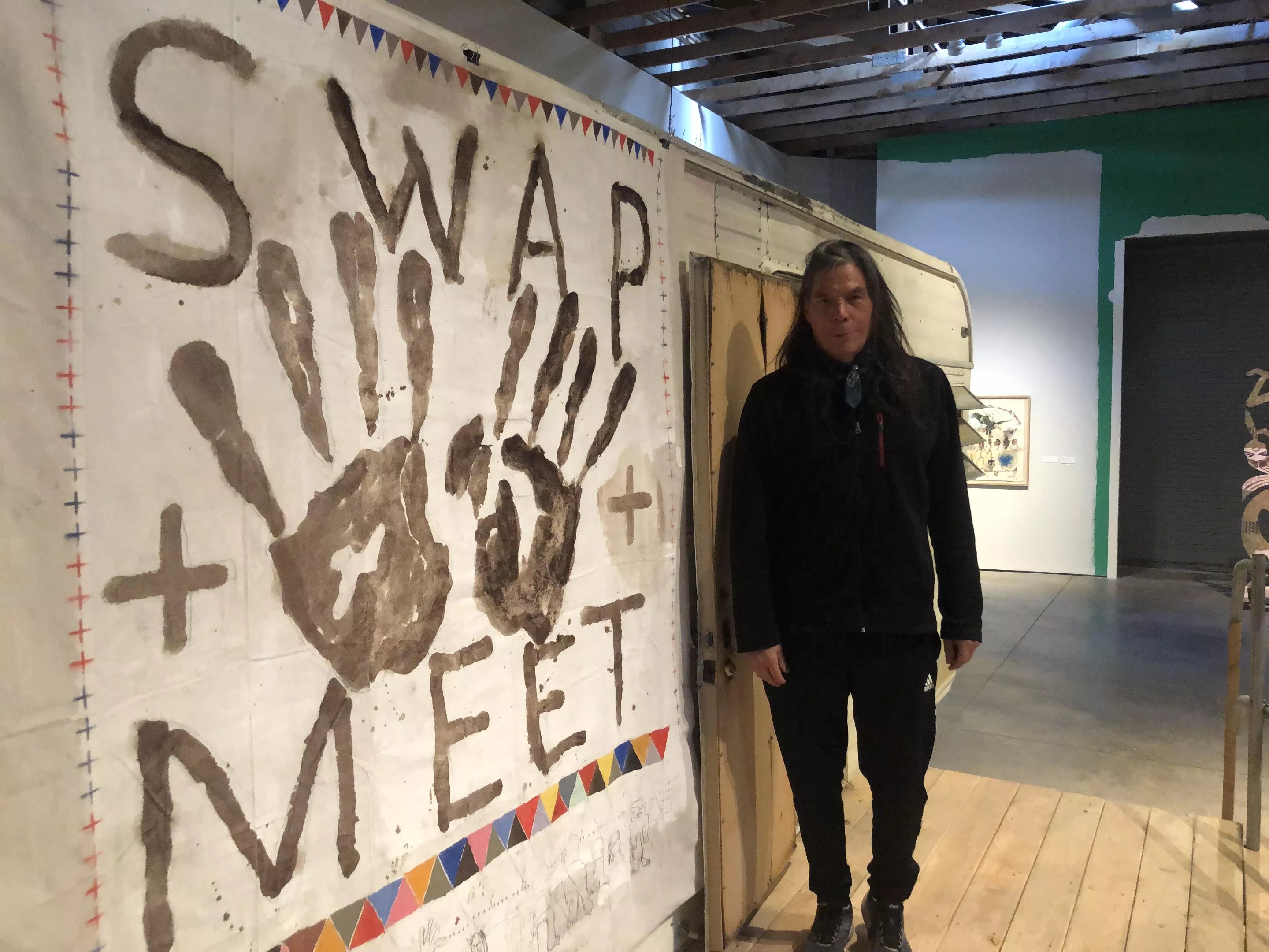 Artist Brad Kahlhamer stands with the centerpiece of his “Swap Meet” exhibition.