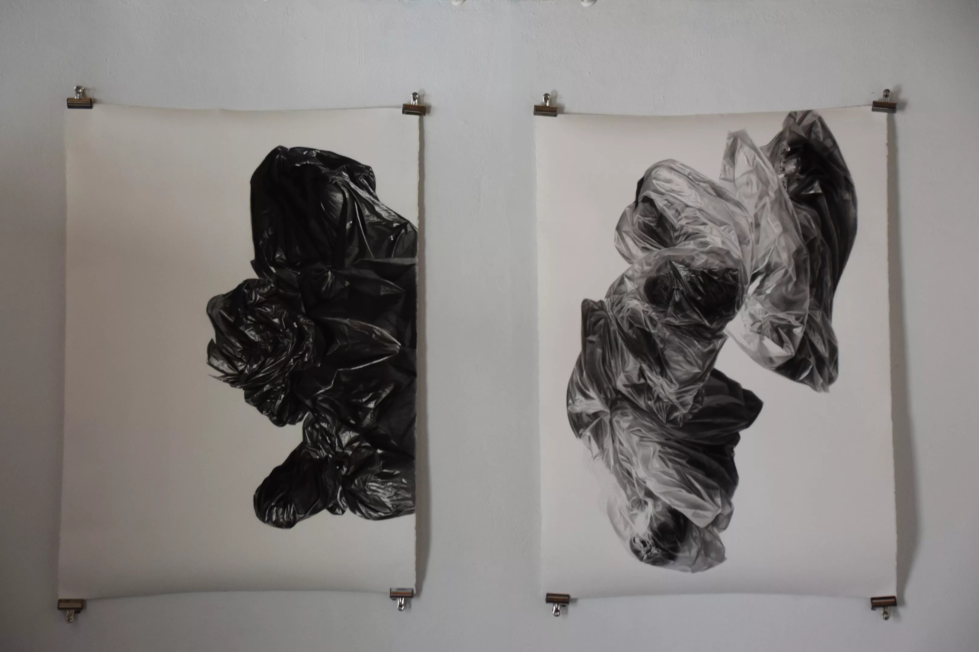 These hauntingly beautiful works are part of Rigo Flores’ exhibition of drawings and photographic works at The Hive, where he explored themes of migration and displacement. The exhibition is titled “#YaMeCanse2.” These pieces were created using charcoal, gesso, and marble dust on paper.