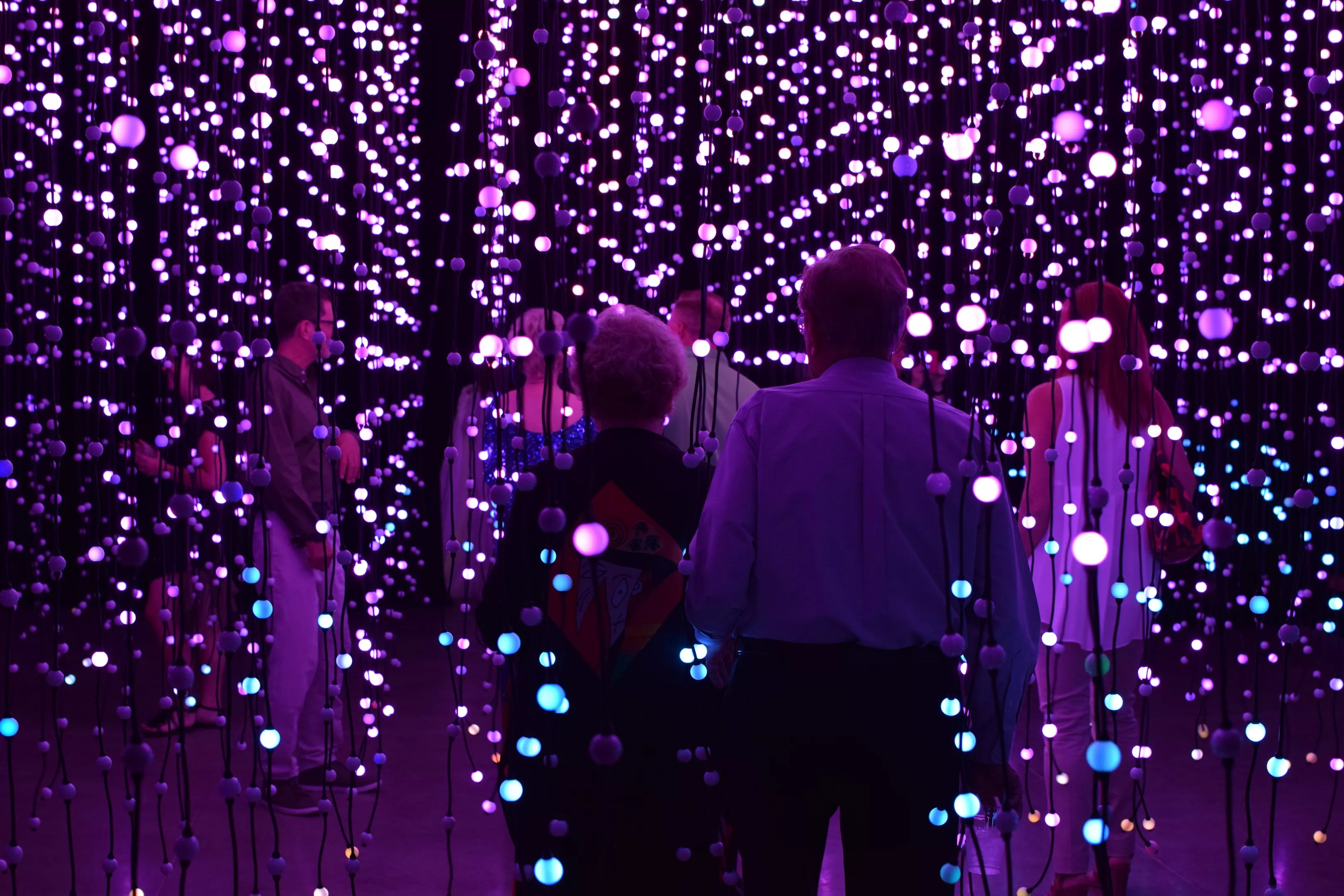 The installation created by an open group of collaborators called Squidsoup fills an entire gallery space at Scottsdale Museum of Contemporary Art. The United Kingdom-based group includes Anthony Rowe, Gaz Bushell, Liam Birtles, Chris Bennewith, and Ollie Brown. The lights change color and design as gallerygoers move through them.