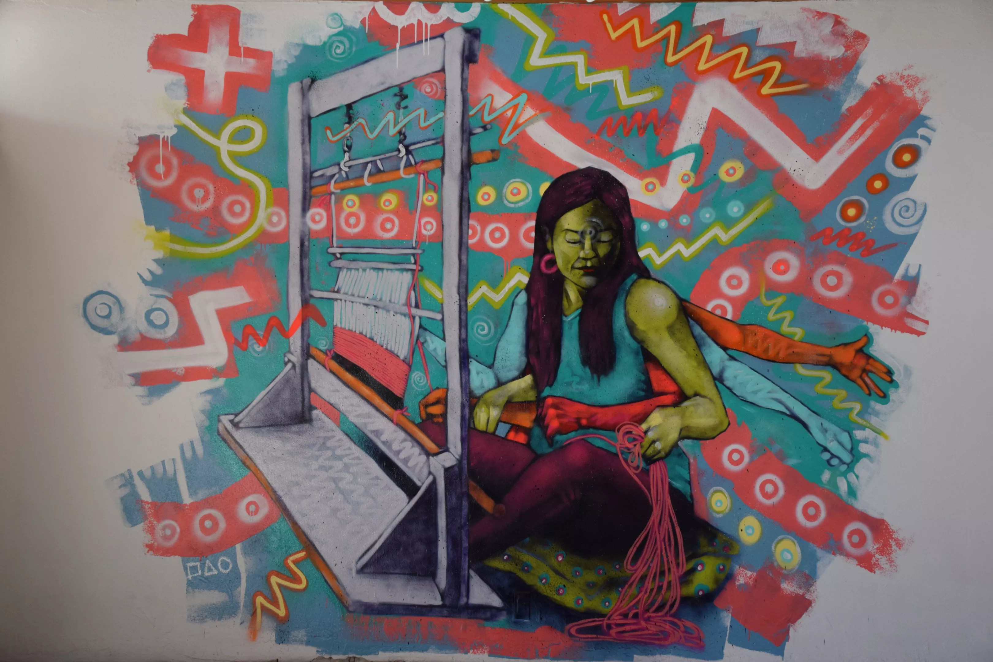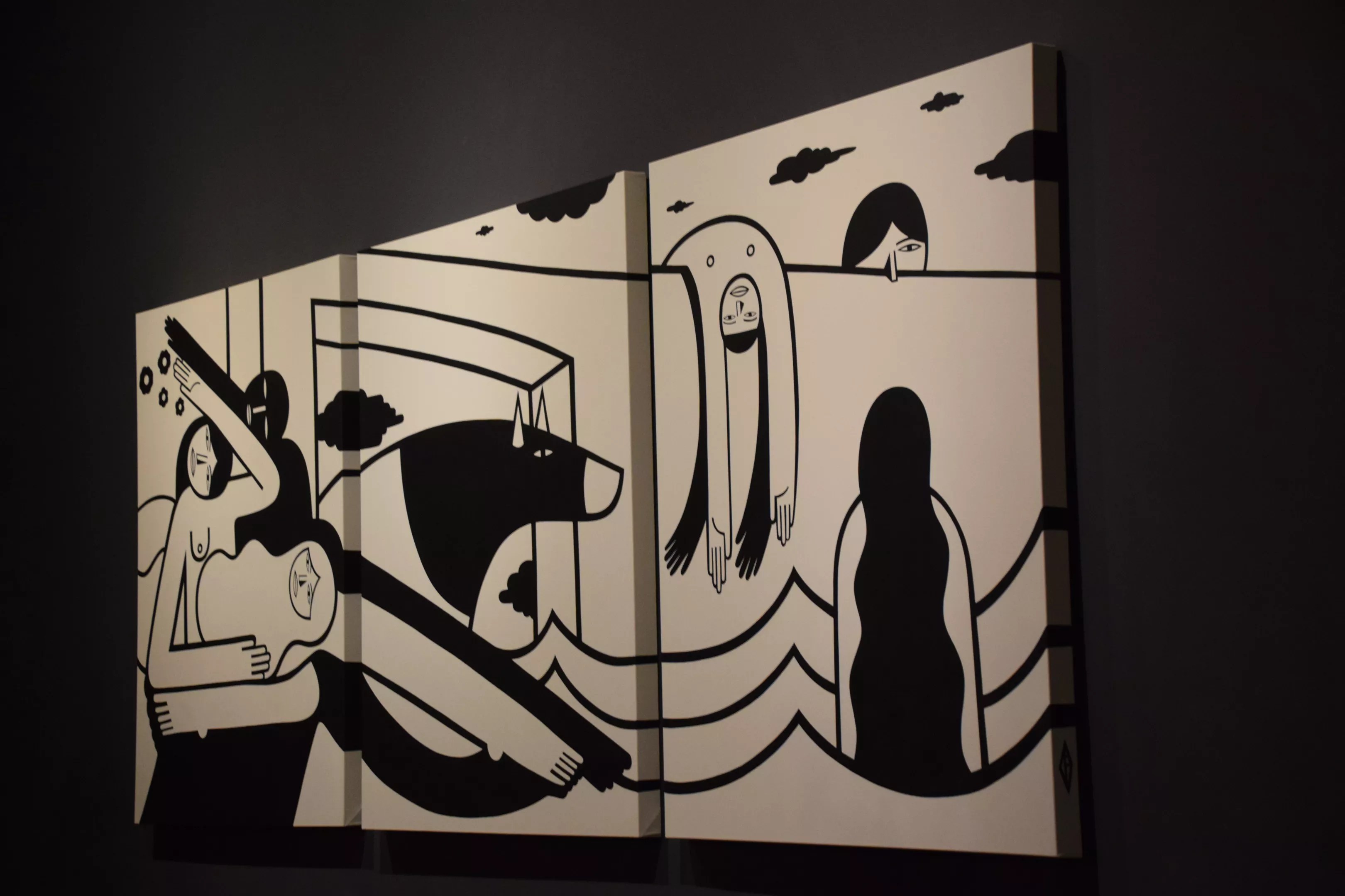 This mural installation piece was part of Jeff Slim’s recent “Born Under Punches” exhibition at The Hive, which also included several paintings exploring women’s power and action amid societal hierarchies and political challenges.