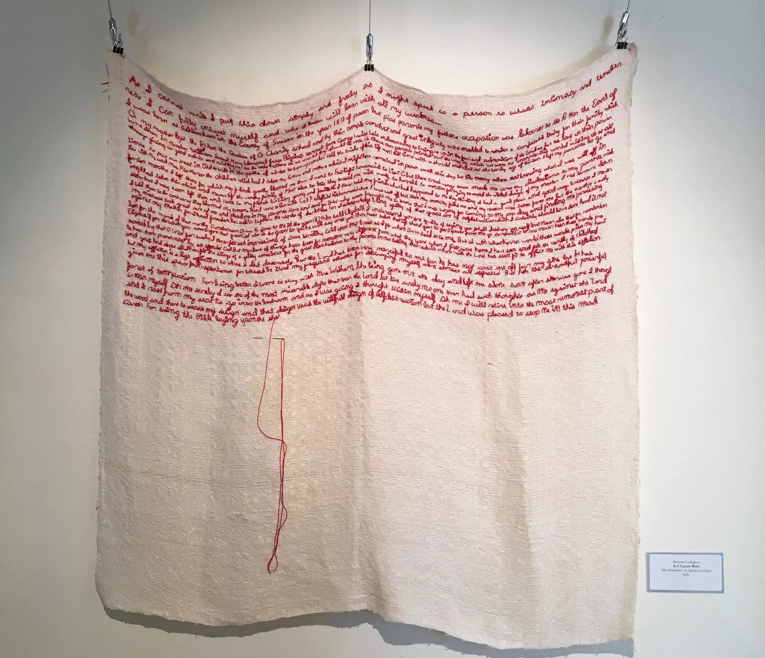 Shannon Ludington created this silk embroidery on hand-woven linen work during 2016 durational performances tied to the “Energy Charge: Connecting to Ana Mendieta” at ASU Art Museum. It recreates a sampler created by a 19th century woman, who used embroidery to recount her rape. Most recently, this Ludington piece was featured in “New Art Arizona” at Shemer Art Center.