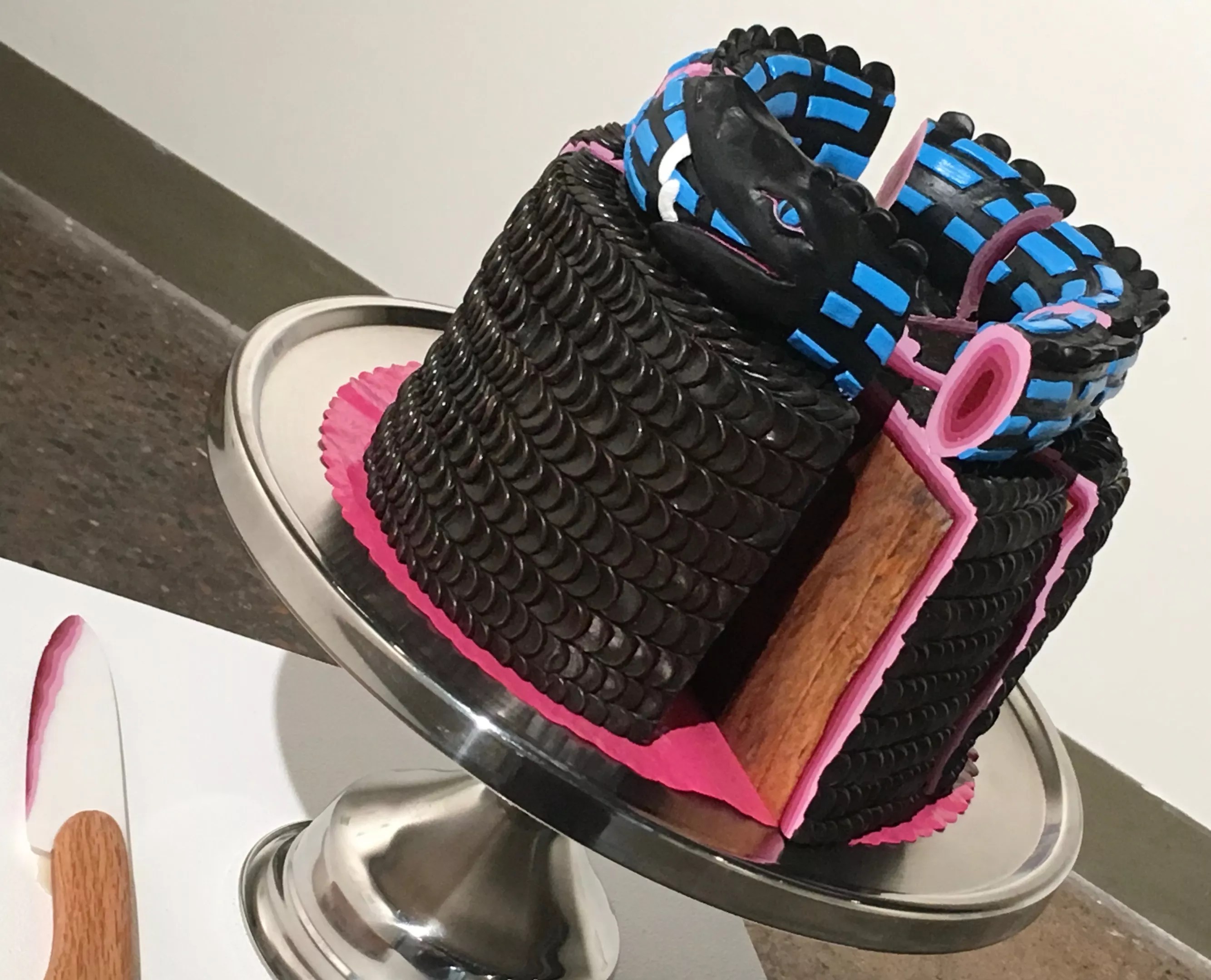 Roy Wasson Valle put a new spin on the familiar expression “let them eat cake” – leaving viewers to wonder about the snake, a creature rich in diverse symbolism within various cultures, atop his meticulously iced confectionery sculpture. Created with Yarnell Red Oak, polymer clay, epoxy, and paint, this piece was featured in a recent exhibition at Grant Street Studios.
