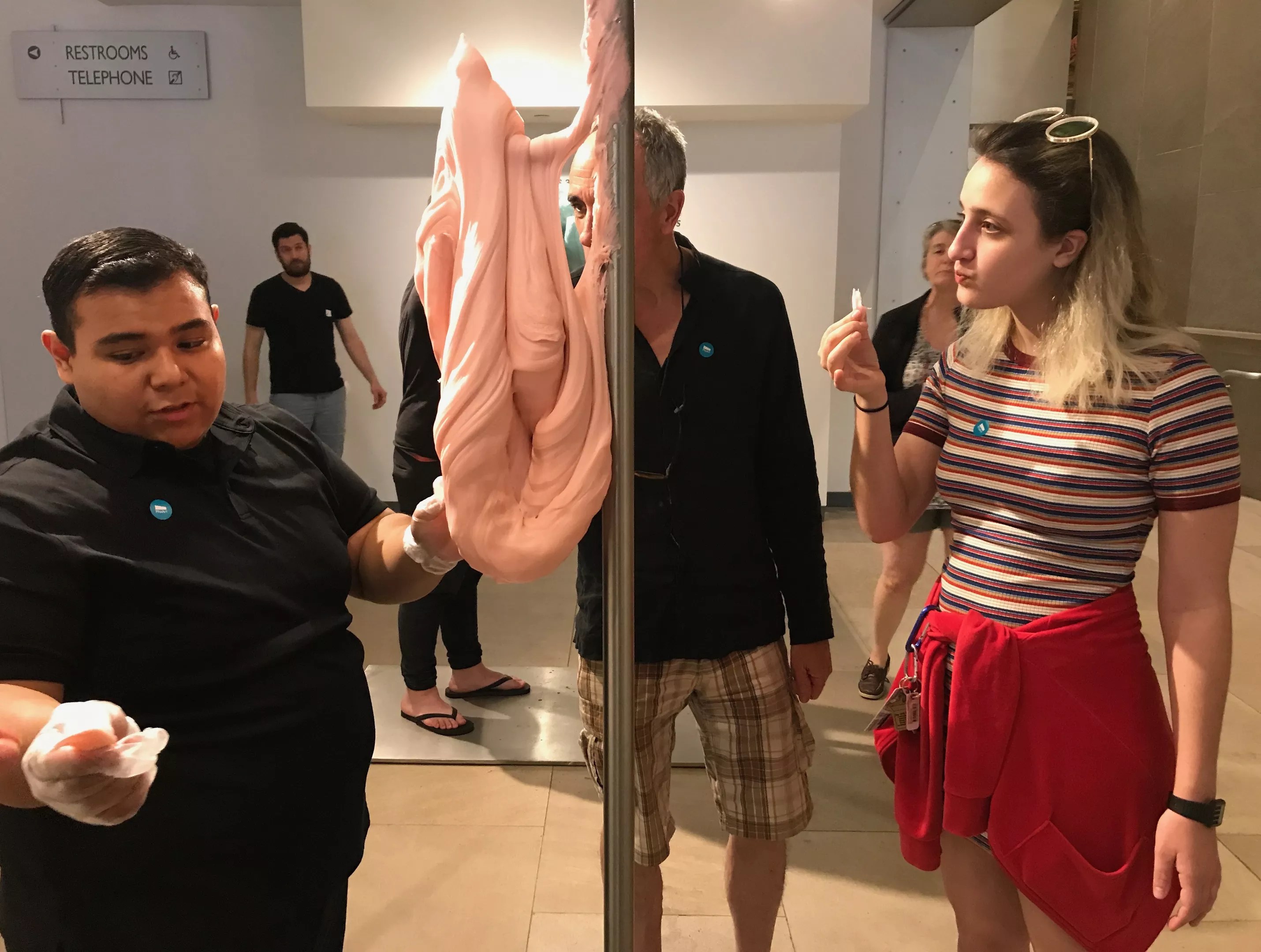 The word “interactive” had become a buzzword in contemporary art, used far too frequently for art that doesn’t deliver on that promise. But that’s not the case with works by Valeska Soares, whose “Any Moment Now” exhibition at Phoenix Art Museum included the periodic temporary installation of sculptural pieces made with taffy. On Saturday, March 24, for example, a trio of large taffy pieces hung from three metal poles placed near the entrance to the exhibition, constantly formed into new shapes by gloved museum professionals who offered small pieces to onlookers. Each sculpture, created in collaboration with New York-based Kreëmart, had a different color, aroma, and taste – created by pairing flavors such as blood orange, bergamot, and lavender.