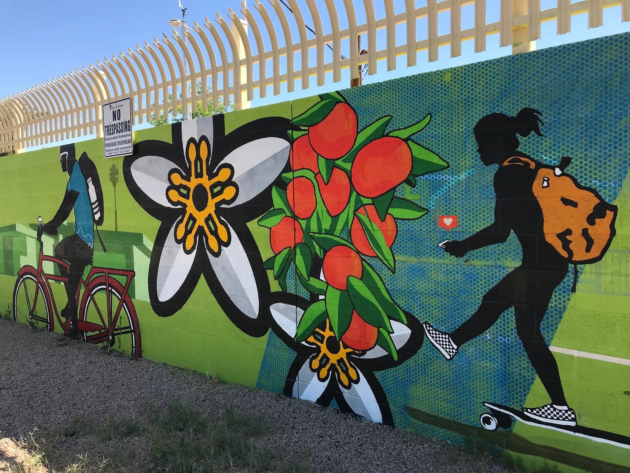 Meet Me at Daley Park by Tempe artist Jake Early is a mural masterwork. Its size alone is worth the drive over to Daley Park, near 15th Street and College Avenue. After a design competition, Tempe Public Art awarded Early the job of painting a wall 400 feet long and 8 feet high. The wall borders a city facilities yard next to a railroad easement. Early managed to turn the stark, industrial area of the railroad tracks and easement into something visually appealing. The colors are vibrant, dominated by light green that symbolizes the area’s agricultural past, and an 8-foot rooster near the wall’s corner. It’s like an outdoor history museum, displaying scenes that encompass Tempe’s past and present as well as college students on bicycles.