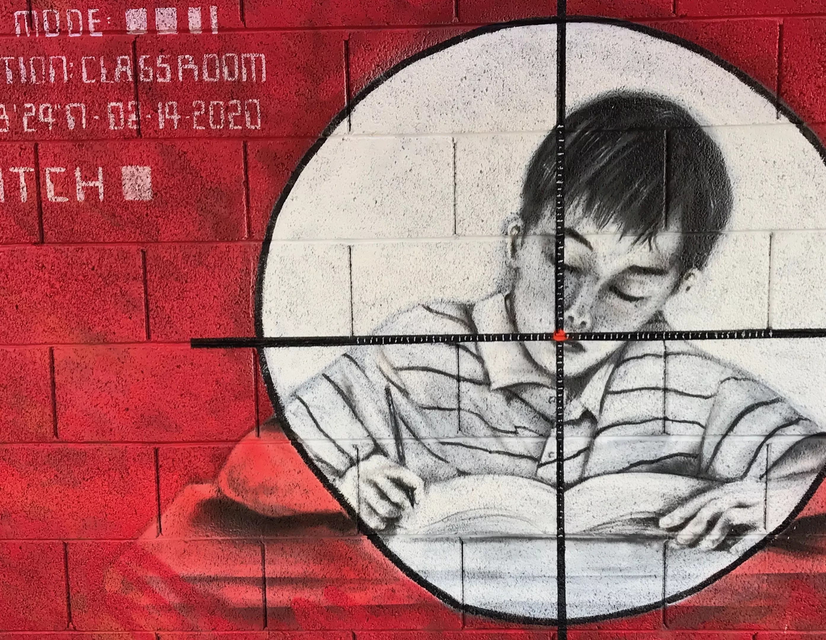 Jeremie “bacpac” Franco painted this mural in the Oak Street Alley near 14th Street in order to address school shootings.