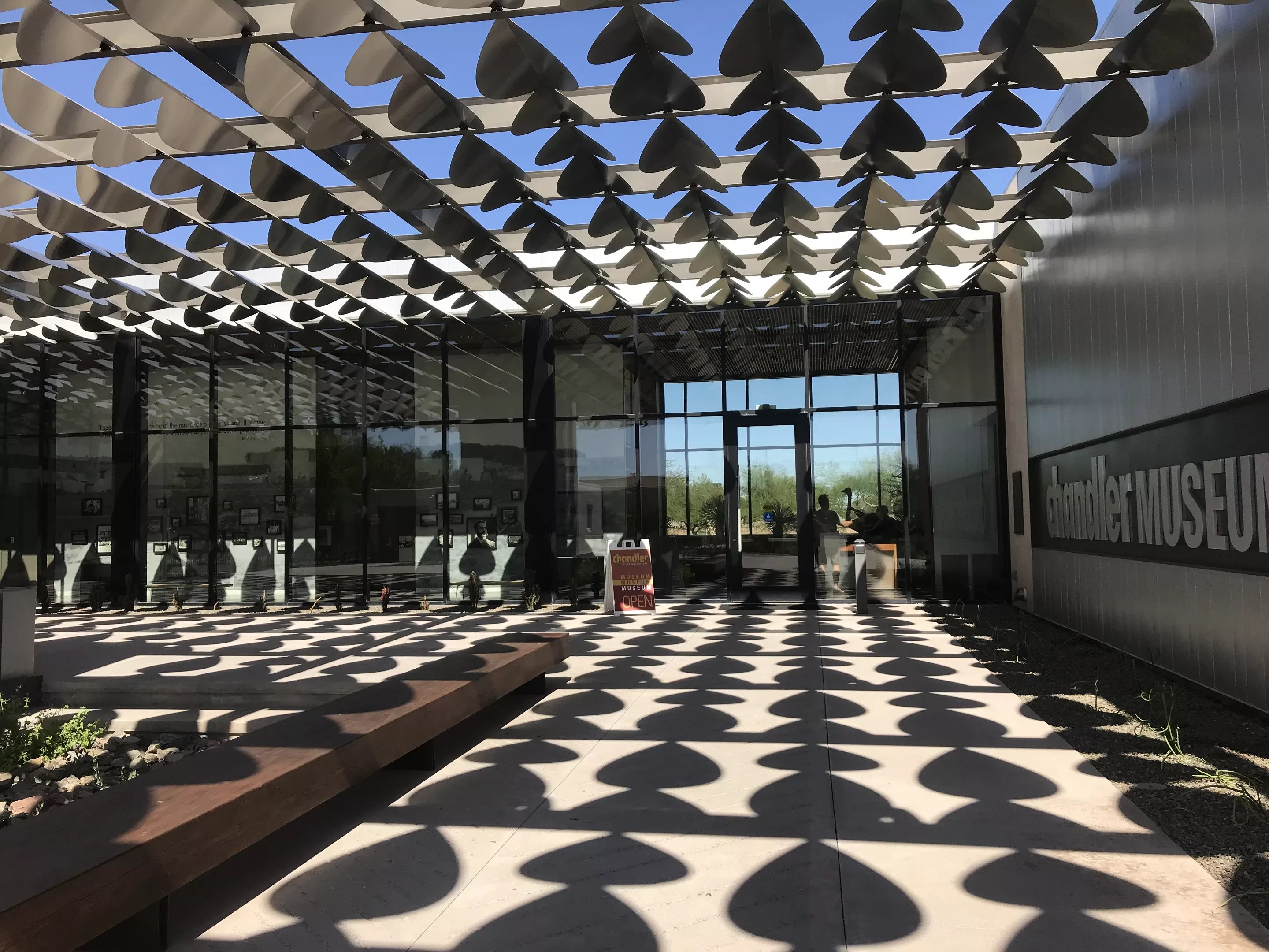 More than 200 laser-cut steel shapes form a sculptural shade structure called Infinite Wave installed near the entrance of the Chandler Museum. Created by Scottsdale artist Jeff Zischke, the public artwork throws a shadow of repeating patterns onto the ground below during the day, the uniform shapes suggesting various natural forms such as leaves, waves, and cactus. At night, the piece transforms into a canvas of color with LED lights in pink, purple, blue, green, and other vibrant colors. Ultimately, the piece is about the intersection of technological and natural environments at the heart of contemporary desert life – a topic we find ourselves thinking about more and more with each passing year, and that we’re grateful to Zischke for illuminating so beautifully.