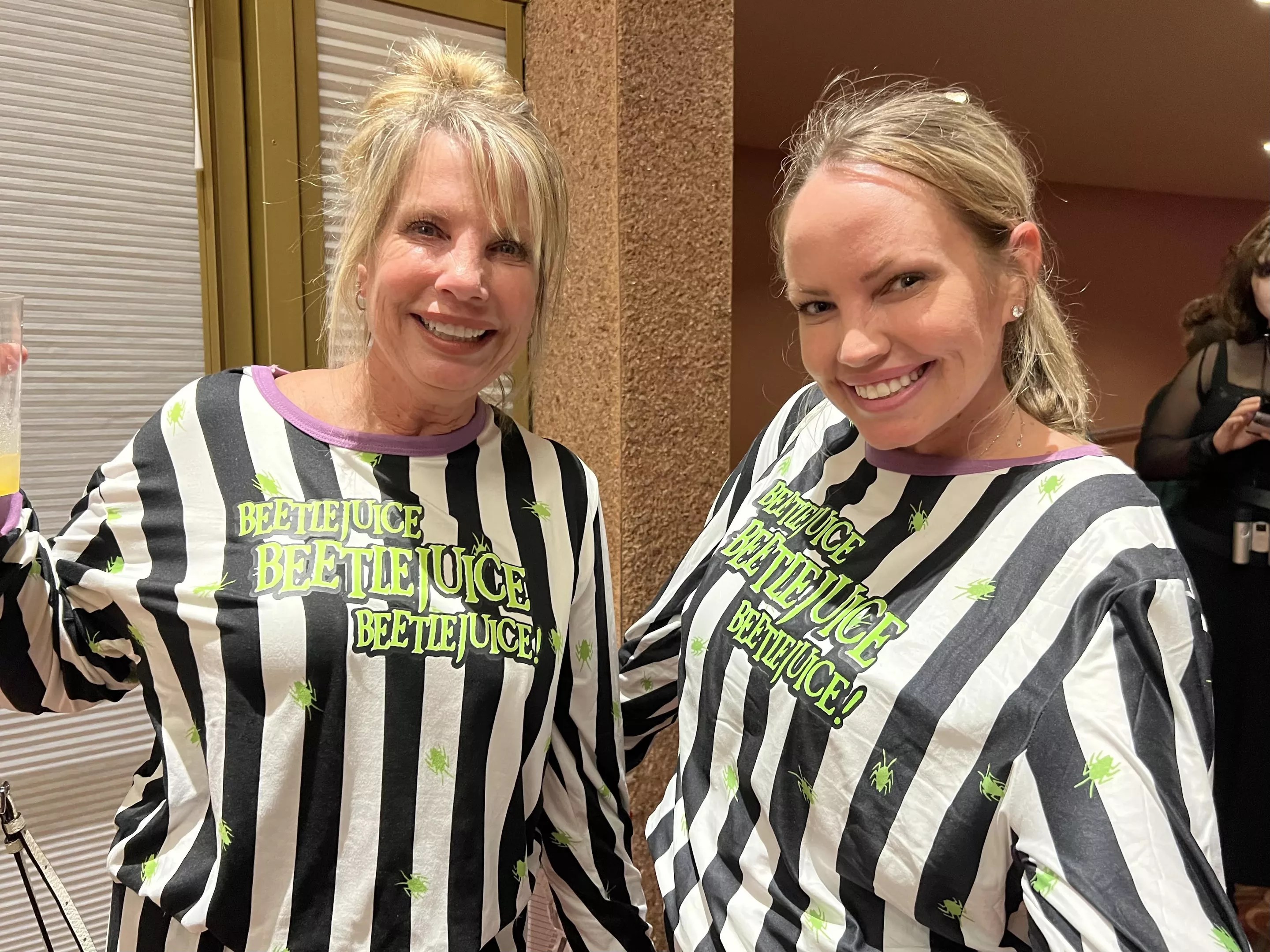 Matching Beetlejuice pajamas make for a comfortable theater experience.