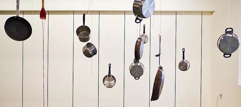 Highlights include a pair of Emmet Potter’s shiny, powder-coated Vietnam-era bombs suspended from the ceiling. Also keep an eye out for Emily Ritter’s books, each made with a month’s worth of recycled materials.