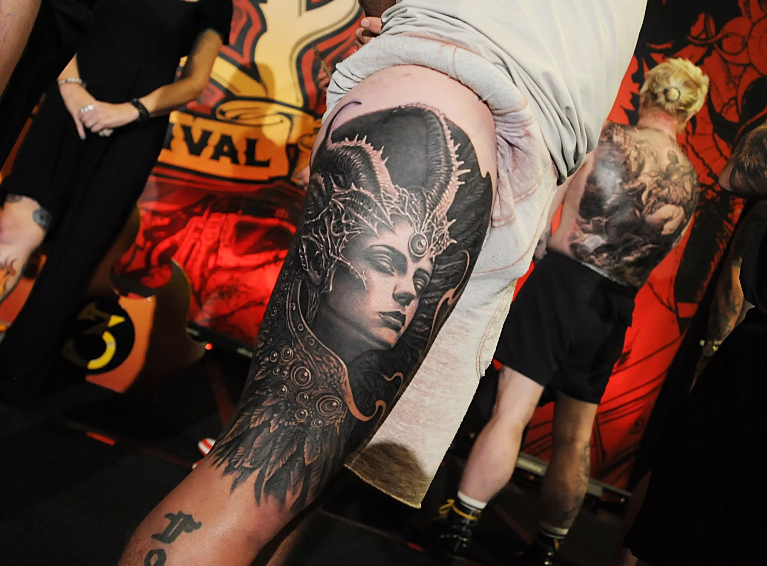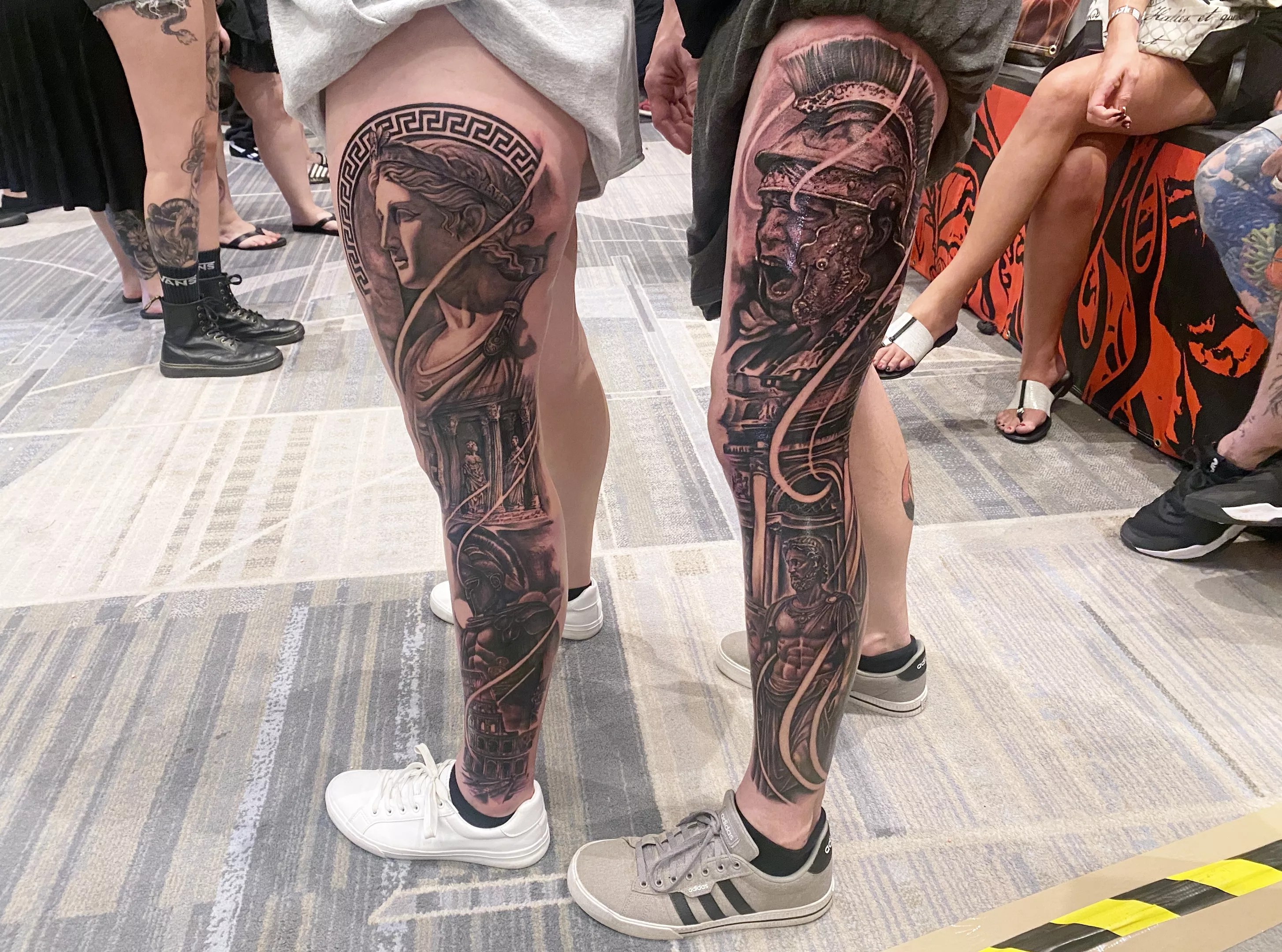 This local couple each got leg sleeves inspired by Roman mythology at this year’s Hell City.