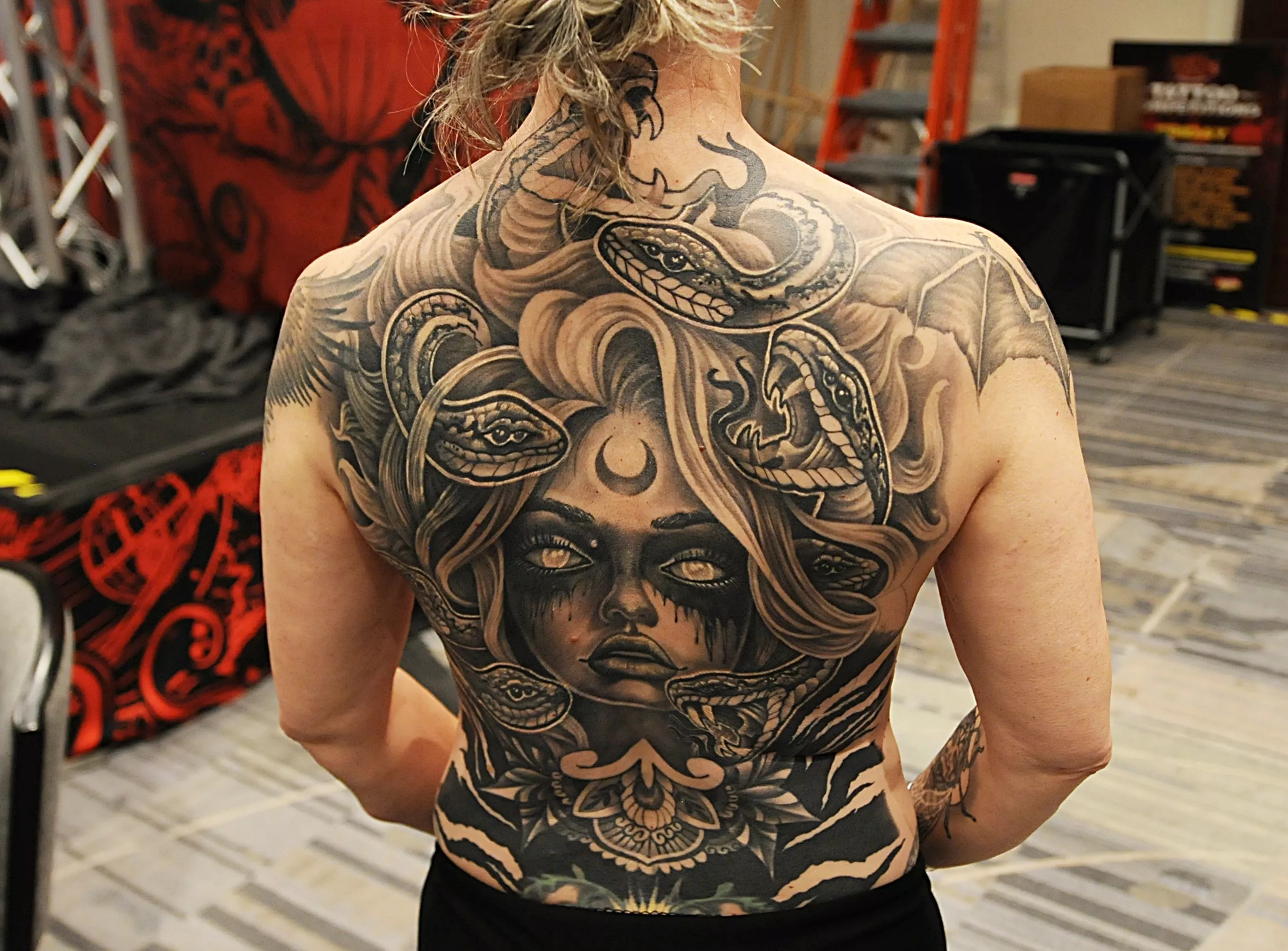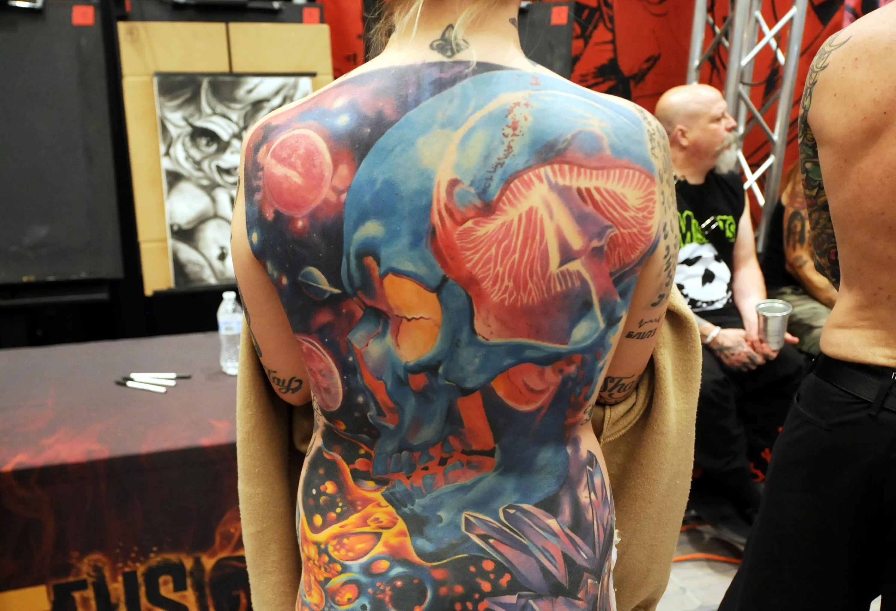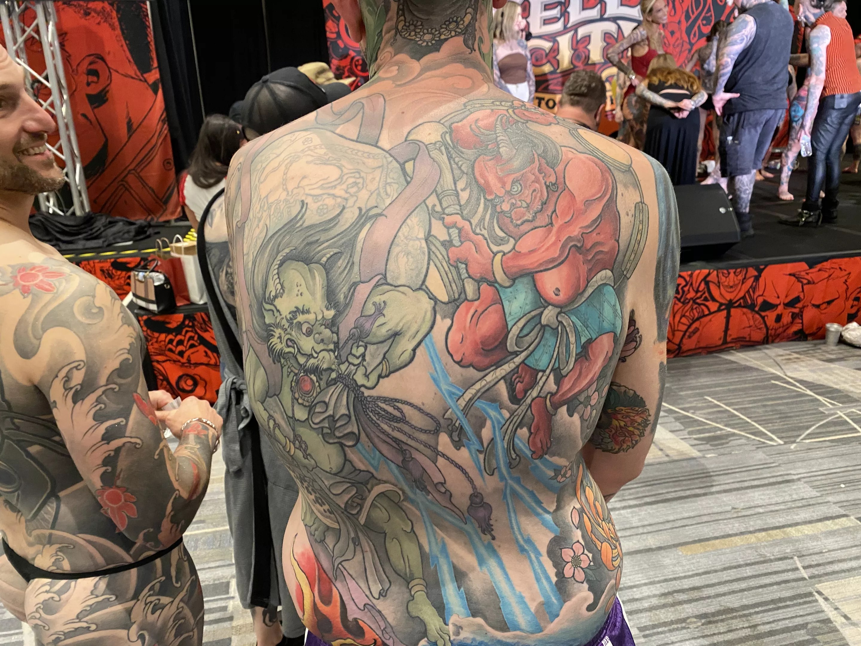 The love of tattoos spanned generations at Hell City 2025. Lisa Mitchell, a 65-year-old resident of Los Angeles, proudly showed off her massive dragon back piece by Brett Herman of Tribute Tattoo in California. She even had some advice for anyone still hesitating about going under the needle.