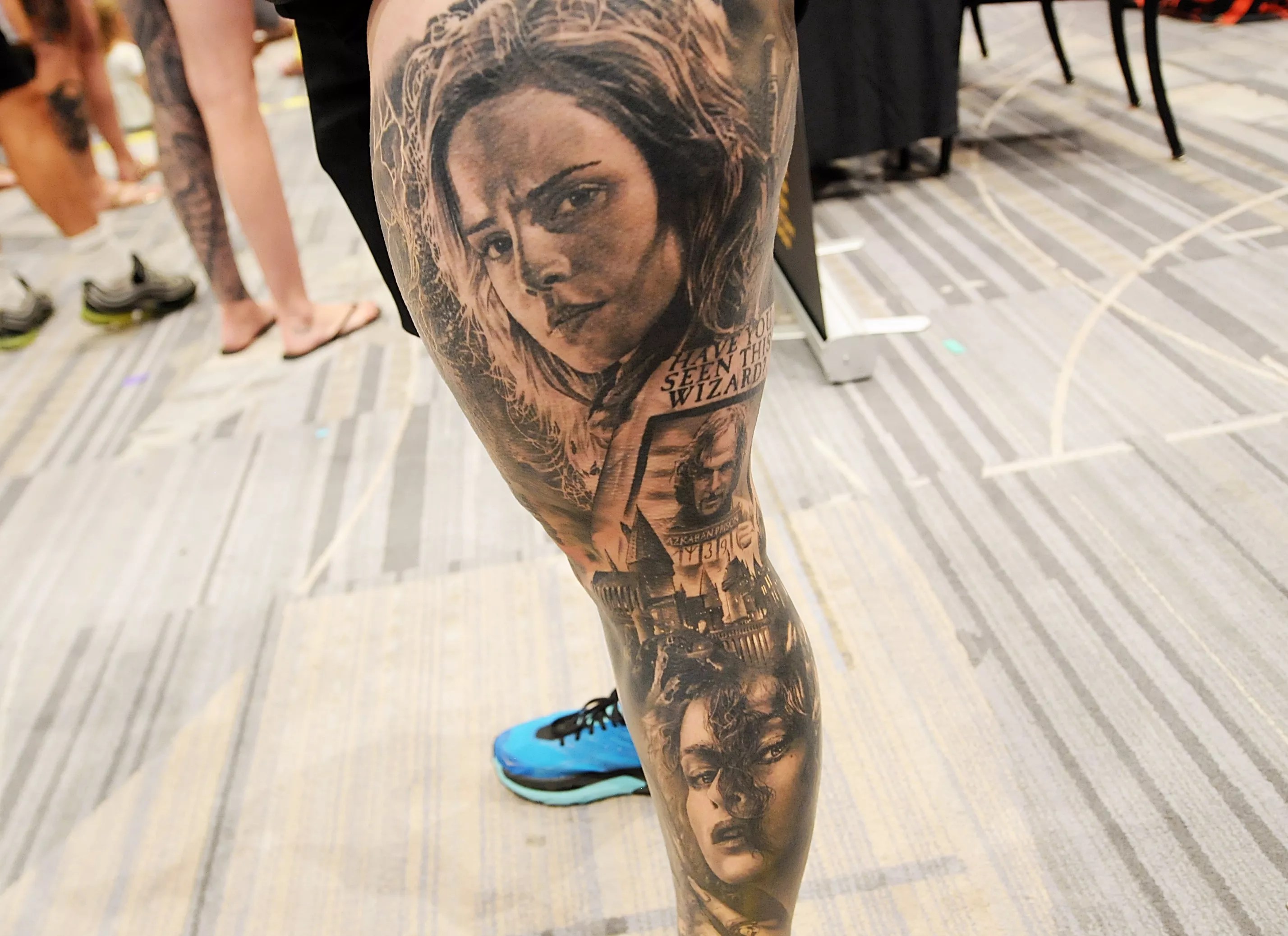 Zak Perry, owner of Thorne Gallery Tattoo Studio in Ohio, used black-and-grey realism to craft this “Harry Potter”-inspired piece.