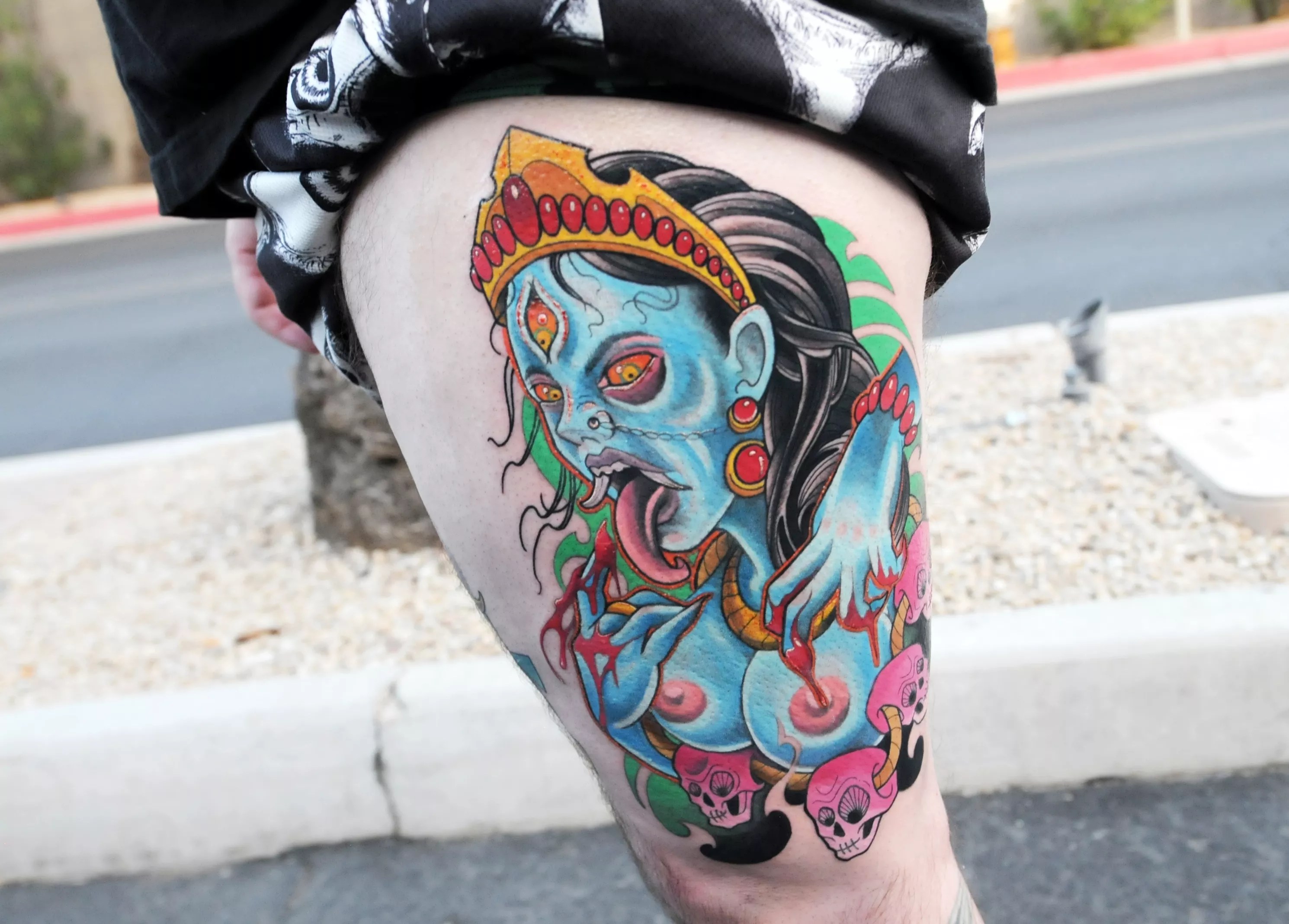 A freshly-inked tattoo of the Hindu deity Kali created at the convention.