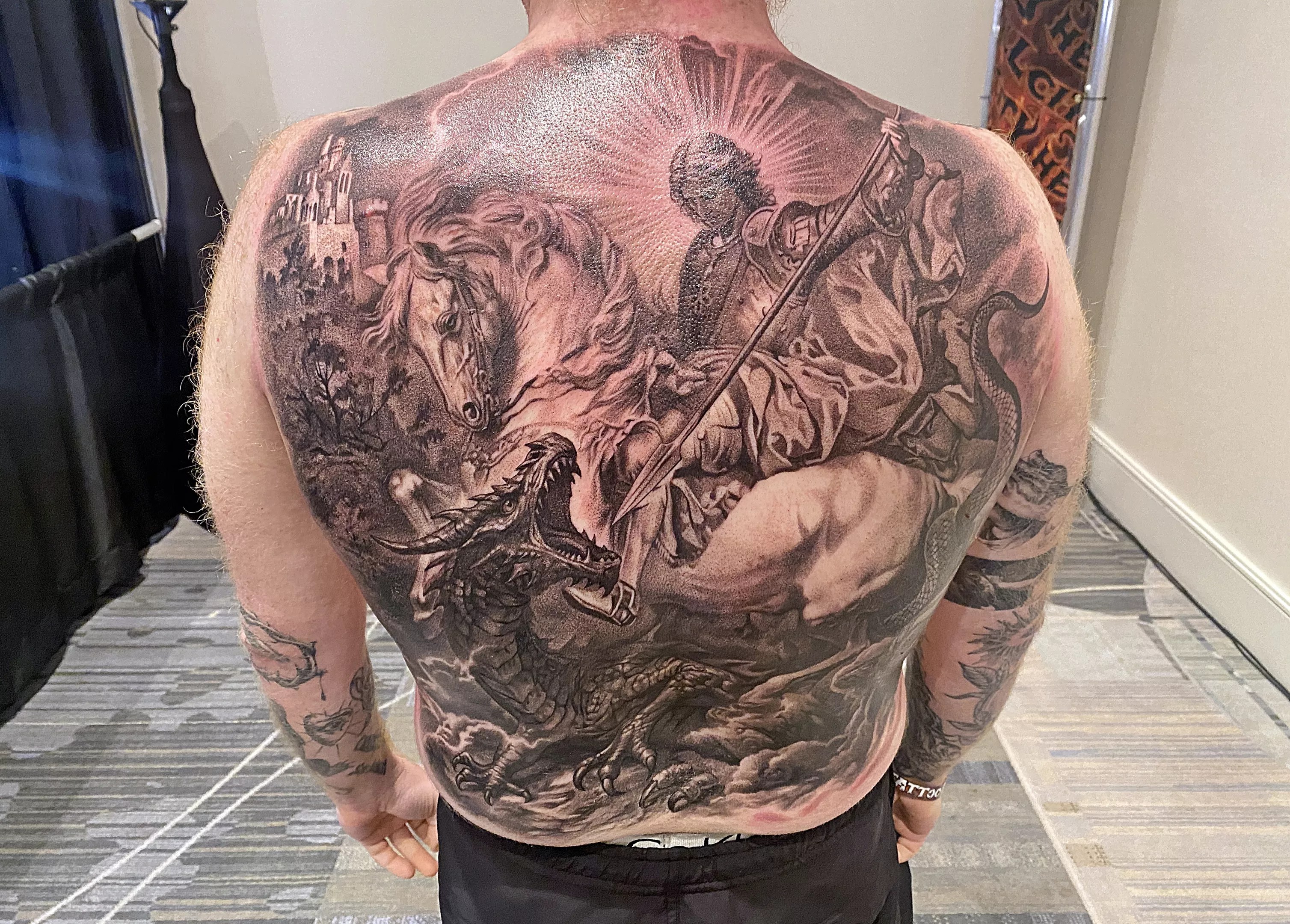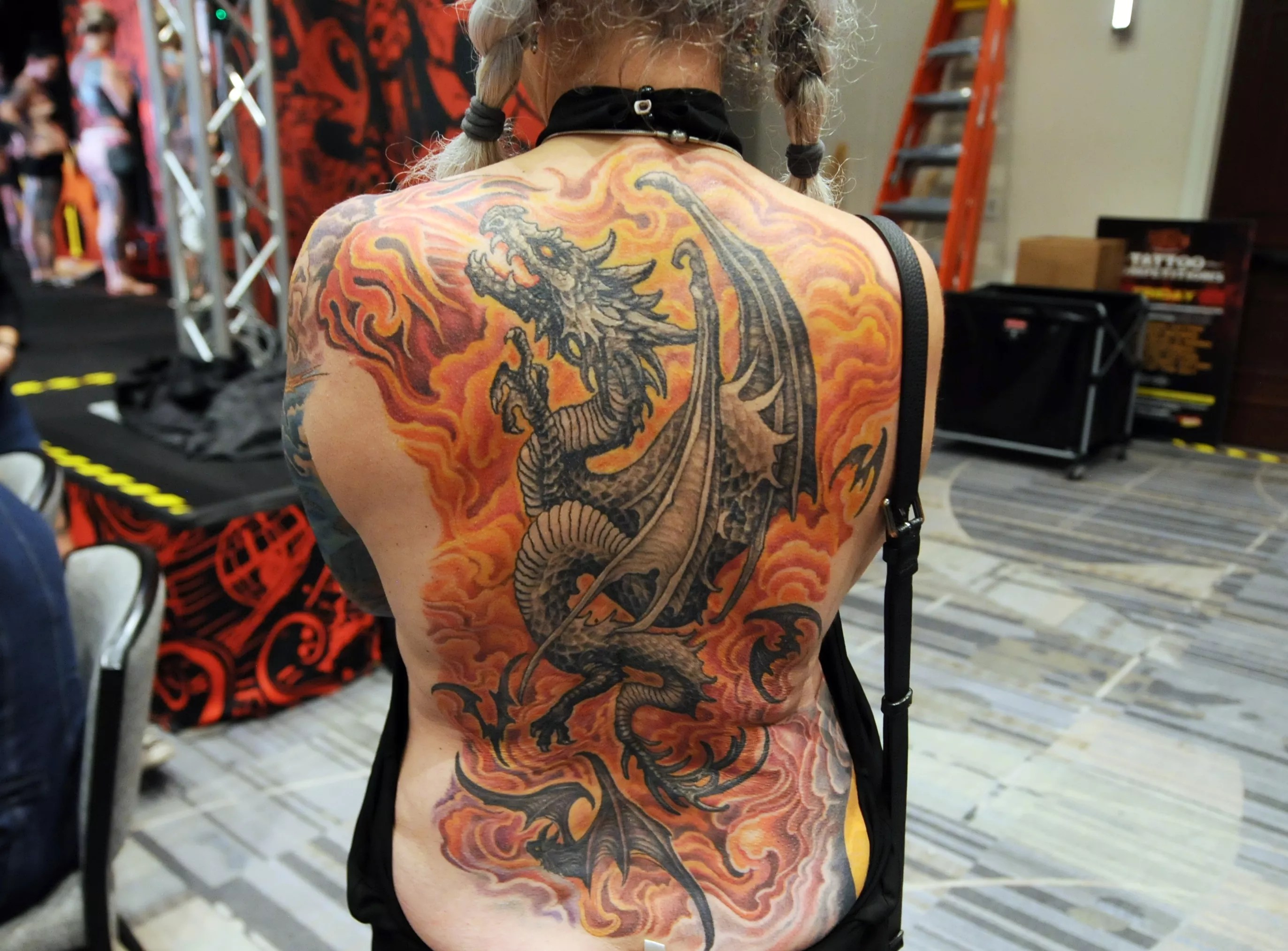 A massive dragon by Brett Herman of Tribute Tattoo in L.A. adorns the back of California resident Lisa Mitchell.
