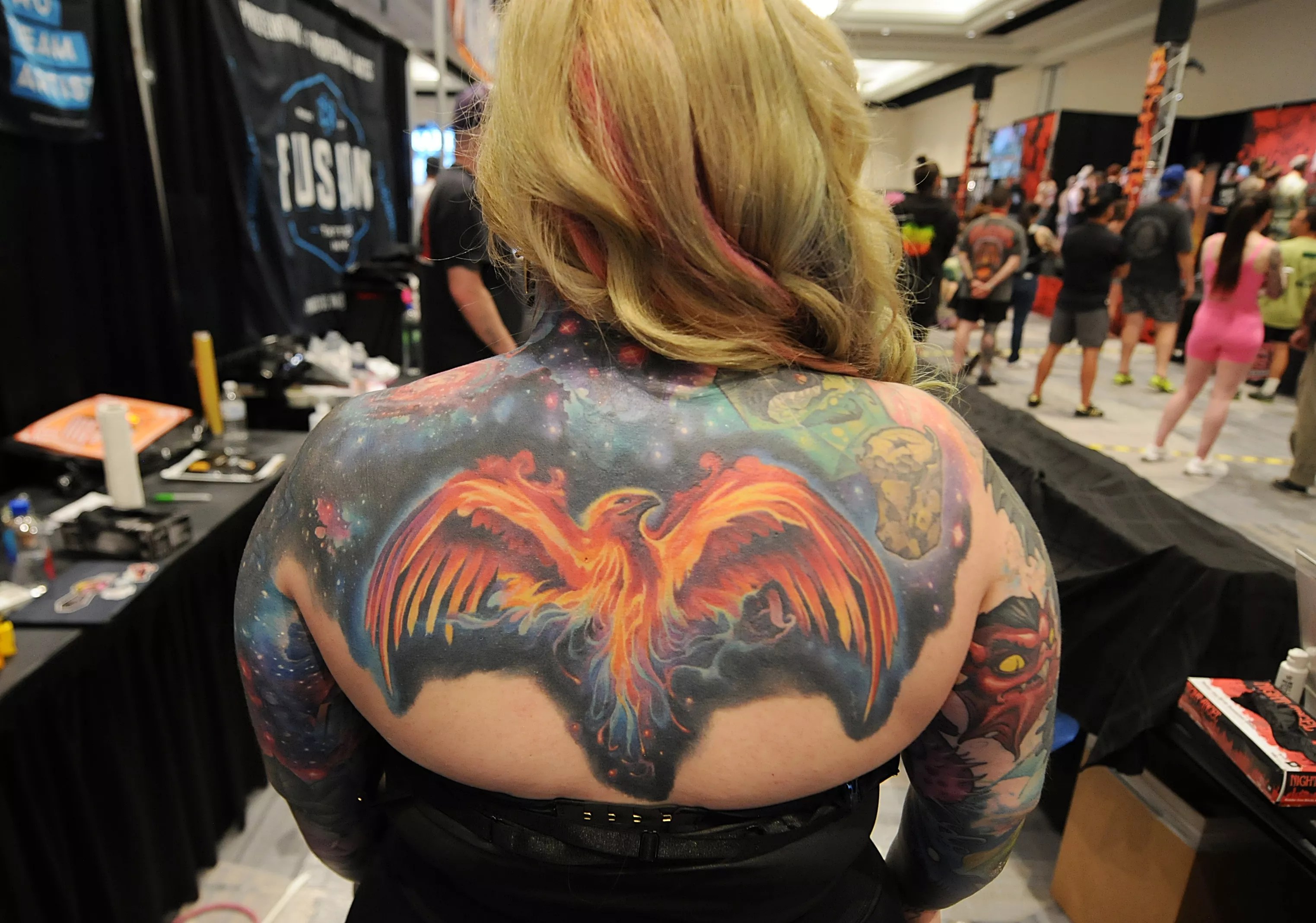 Artist Angela Wood of Obsidian Moon Tattoo in New Hampshire has a fantastic-looking phoenix on her shoulders that was inked by Tyler Malek of Underworld Tattoo.