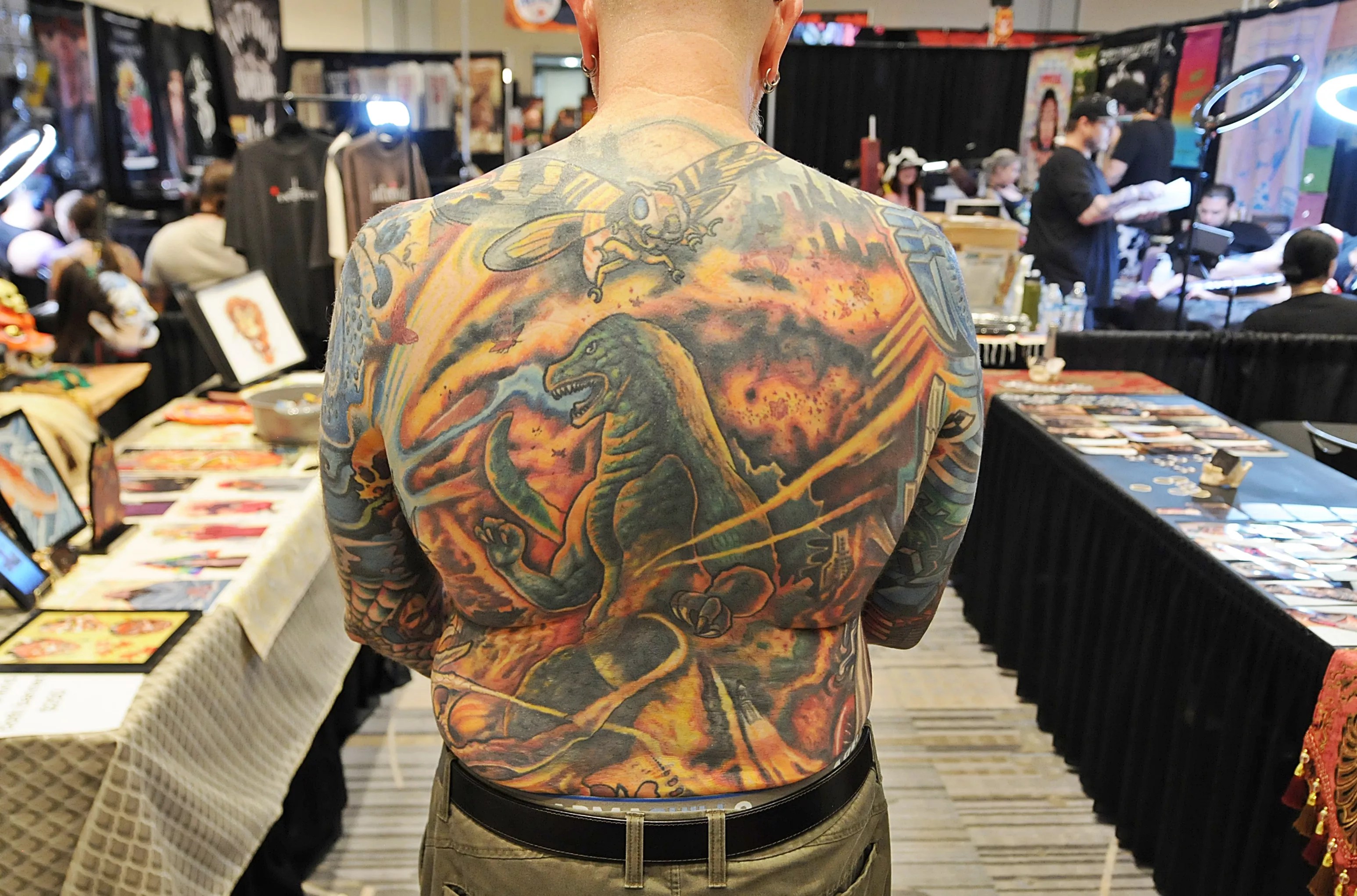 Godzilla and Mothra clash in an epic back piece adorning Dallas resident Peter Stauber that was inked by Dave Barton of California’s Lucid Tattoo Company.