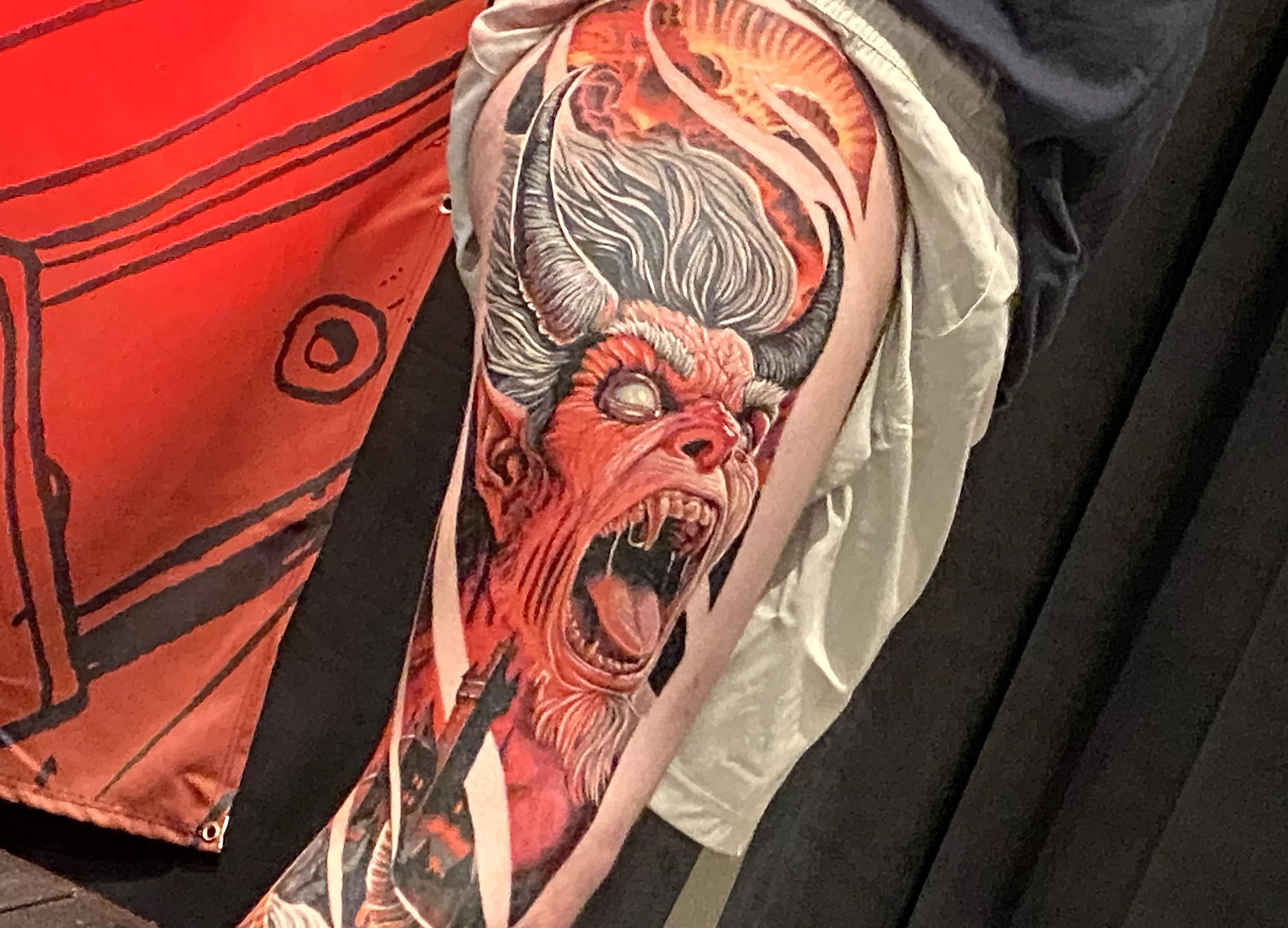 Massachusetts resident Katey Bassett shows off her intricately detailed Krampus tattoo created by Gabriel Londis of 9th Realm Gallery.