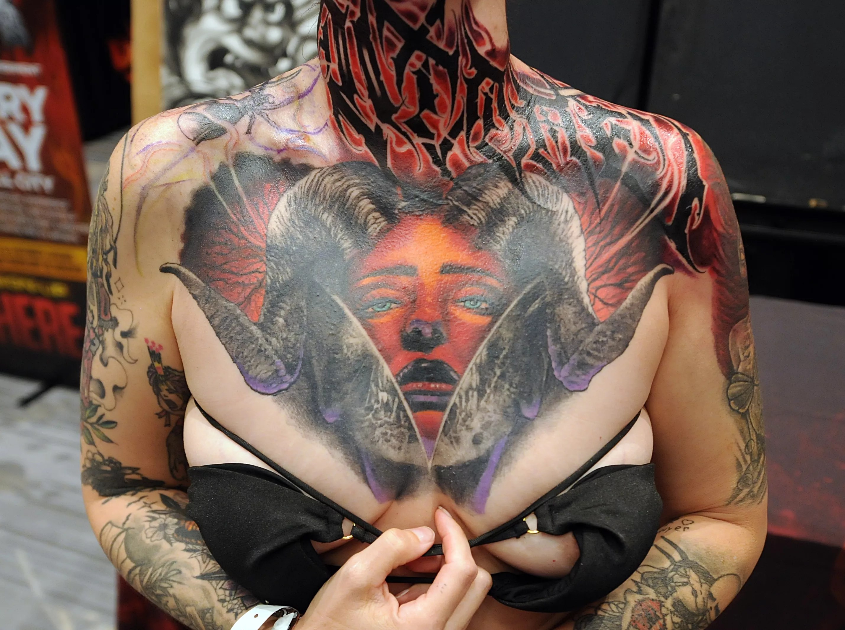 Joseph Delaparra of Award Winning Tattoo Society in Illinois created this devilish chest piece on Chicago resident Jennifer Drake.