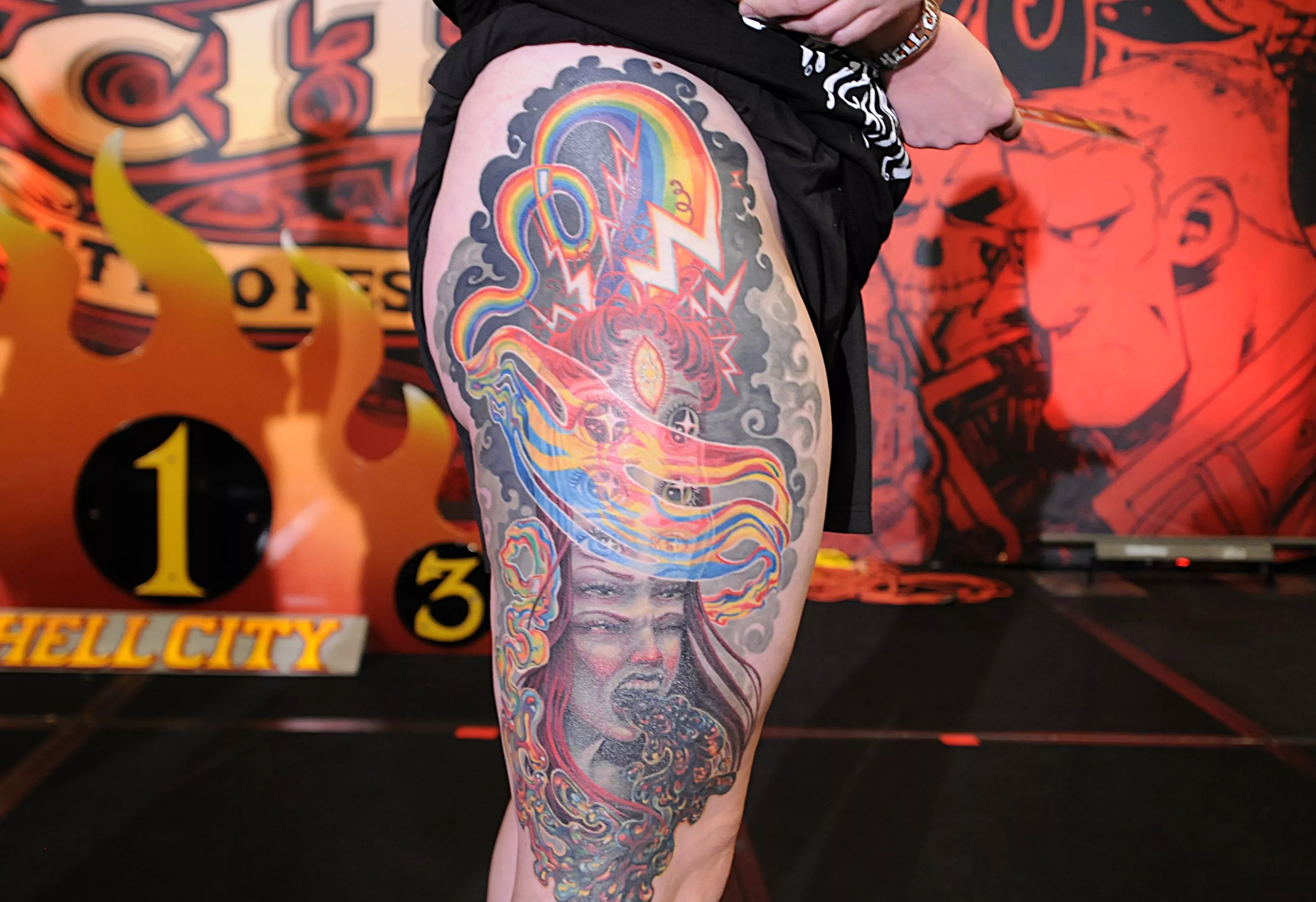 Showing off something wicked during one of Hell City’s many tattoo competitions.