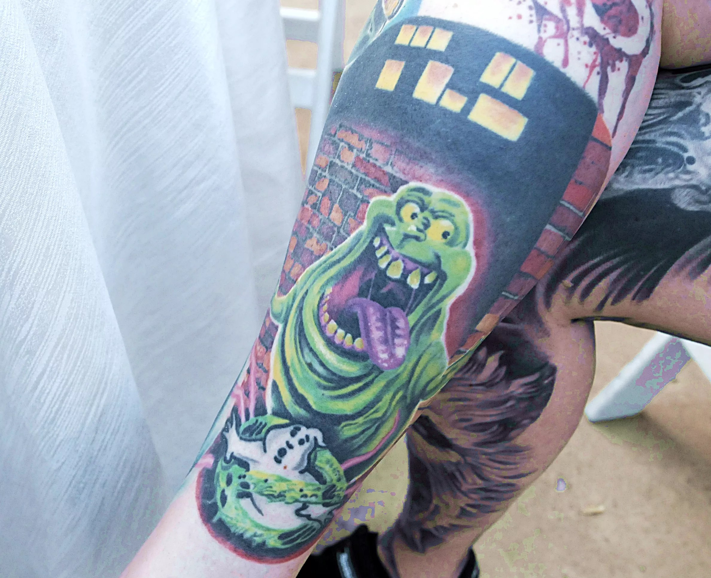 Mark Melanson of Darkart Tattoo Collective in Ahwatukee inked this playful Slimer from “Ghostbusters” on his wife Crystal’s leg.