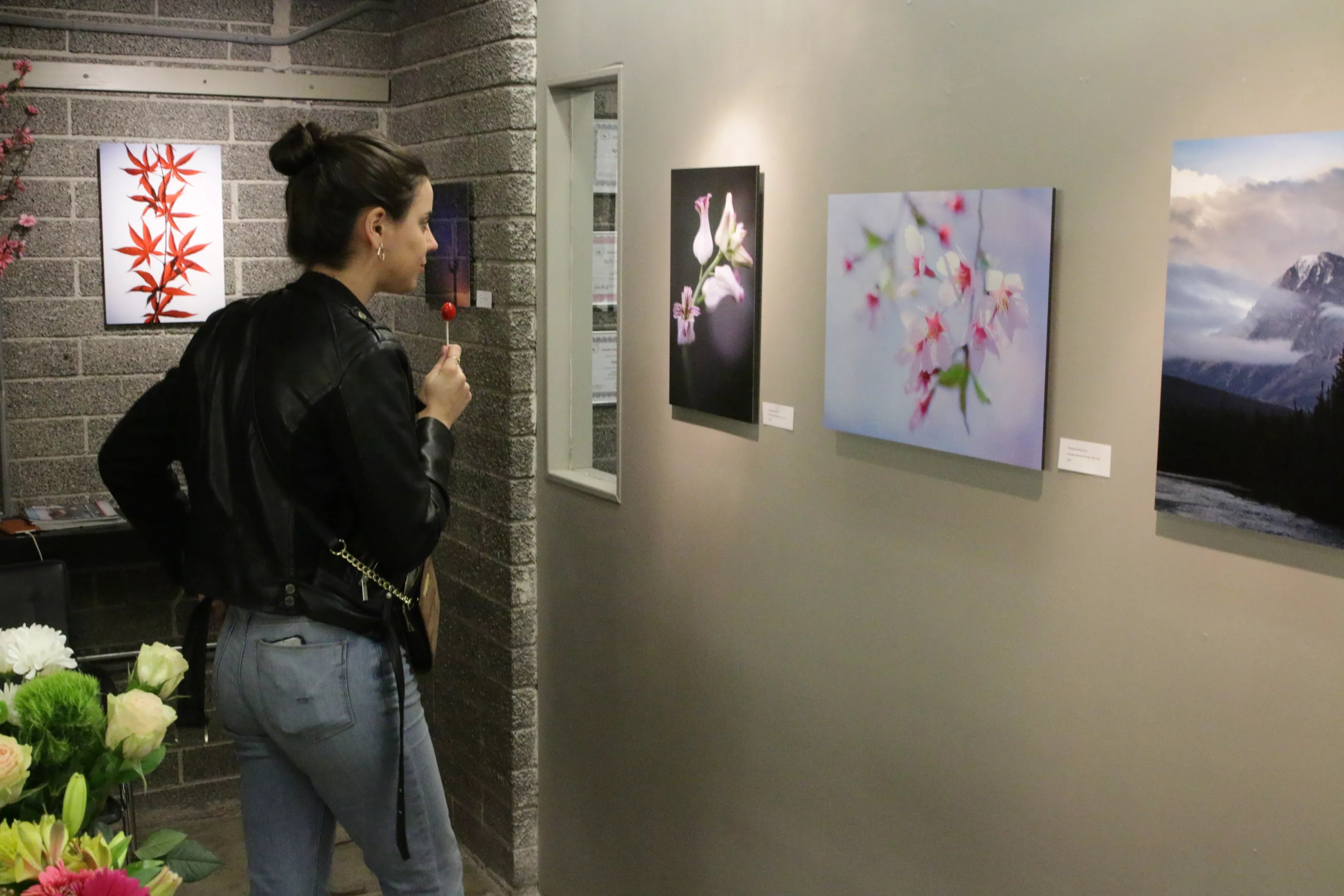 “retro(per)spective” is Lisa Marcelle Nowitz’s first exhibition since she earned her photography degree from ASU in 1998. She embarked on a career in IT, but she never stopped taking photos. Many of this show’s images were captured on excursions into the wilderness during business trips. An attendee observes the detail in one of Lisa Marcelle Nowitz’s photos. Anthony Wallace