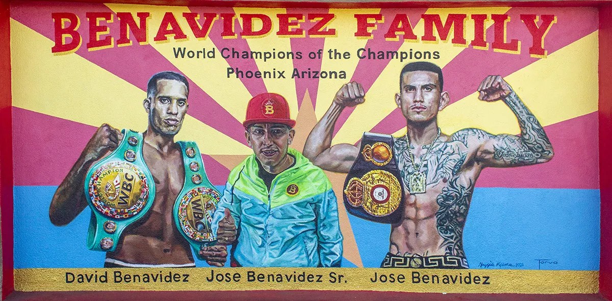 On a muggy morning in August, Al Milligan, the gym’s manager and co-owner, is preparing to add three more faces to the mural. They all have the same last name: two-time World Boxing Council super middleweight champion, David Benavidez; his older brother and welterweight contender, José Benevidez Jr. (Junior); and their father (who is also their trainer), José Benavidez Sr.