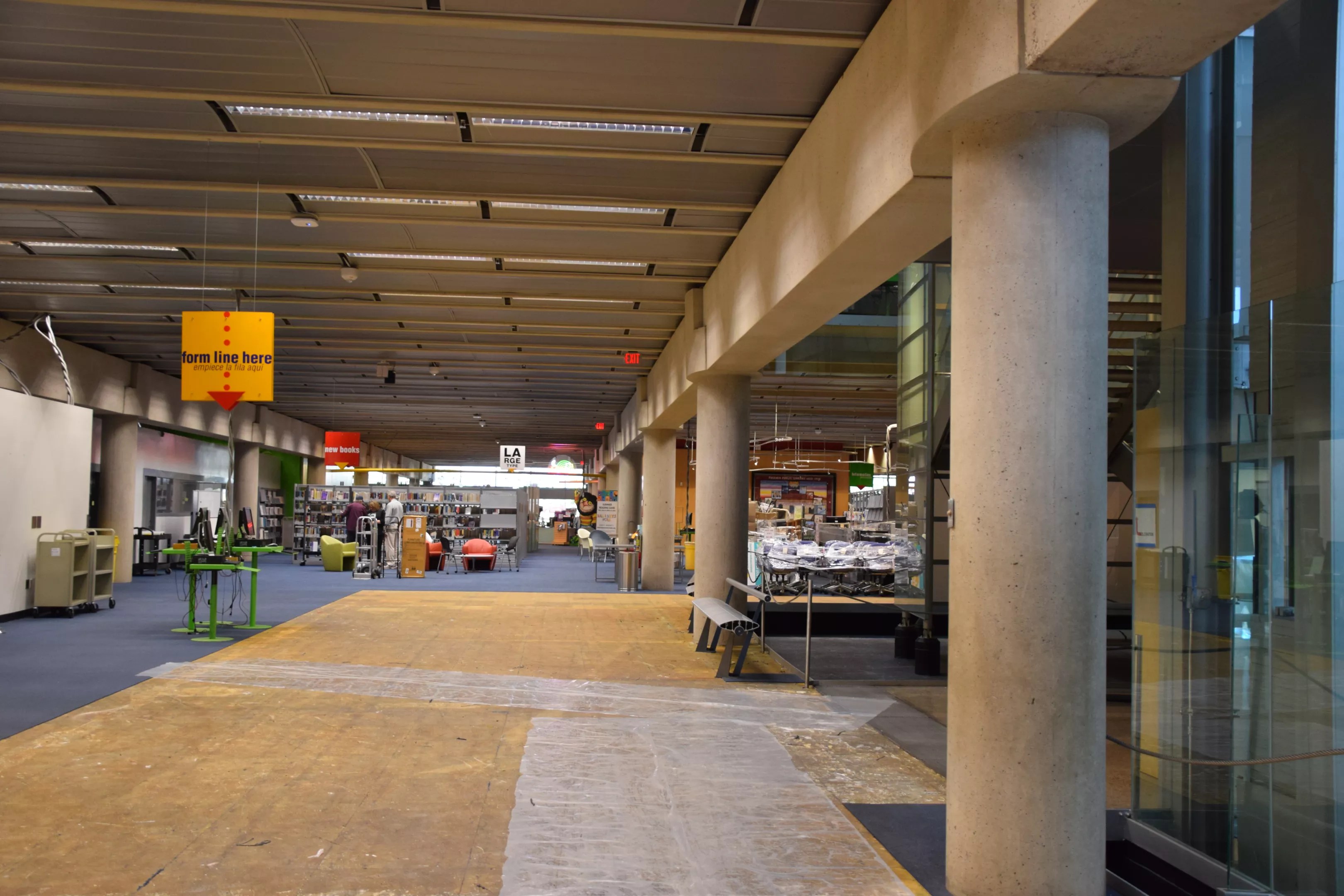 The building itself suffered considerable damage, which is still being assessed. Visible signs of the storm’s aftermath inside the library include concrete floors without carpet, open drywall, and remaining items wrapped in plastic.