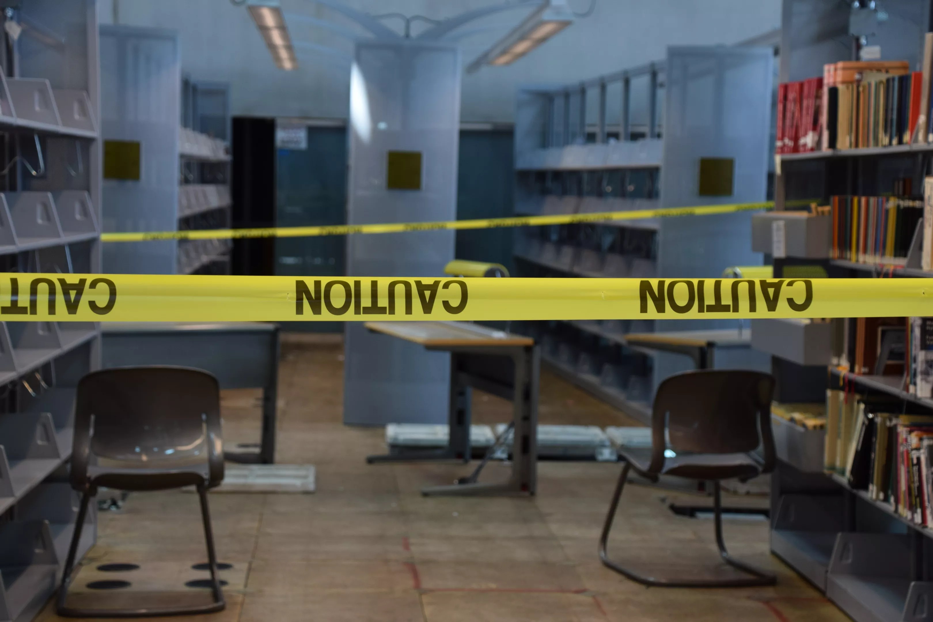 Stacks emptied of damaged books at Burton Barr Central Library.