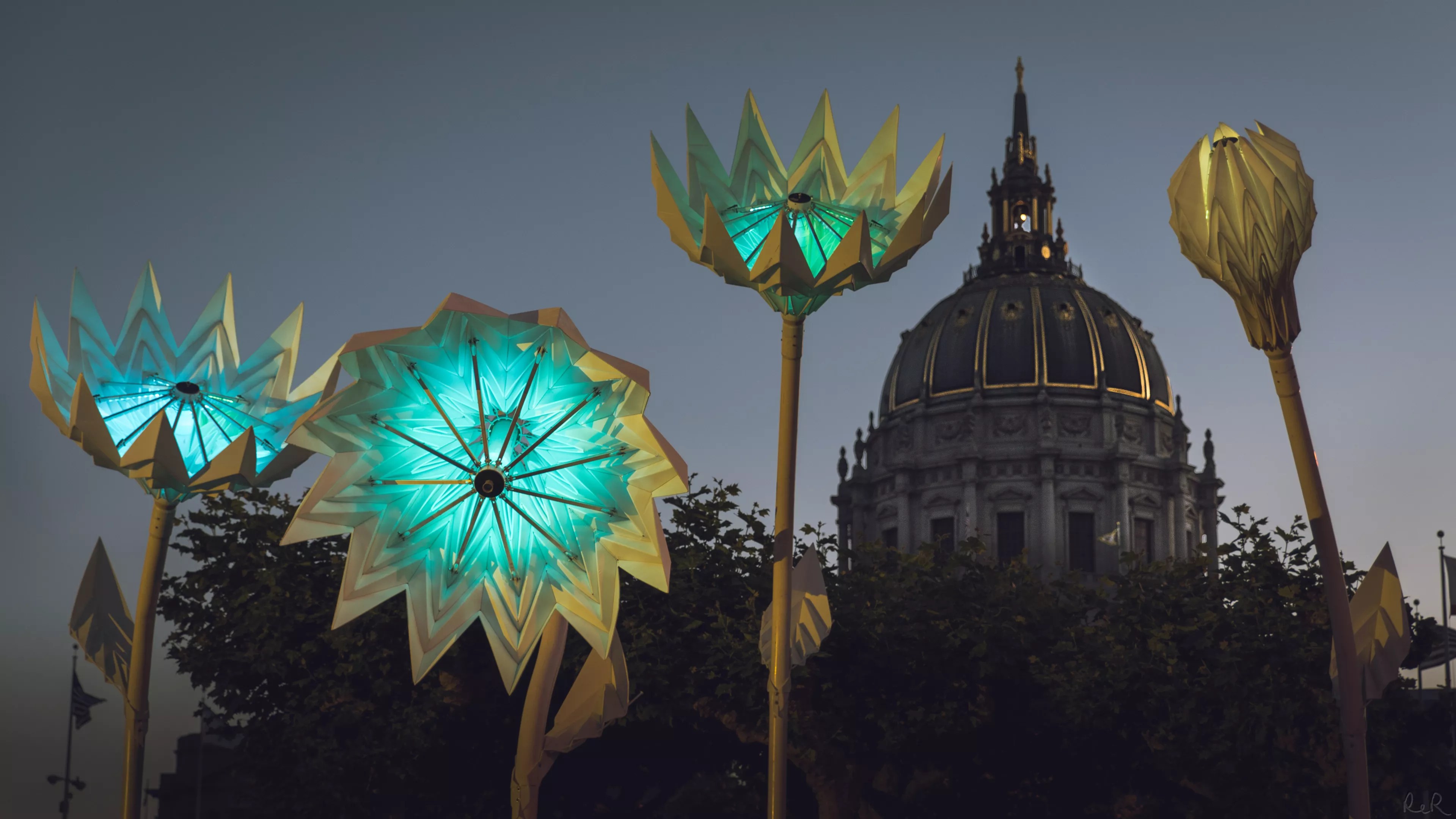 Seven large-scale origami flowers that bloom and glow in different colors as people move around them, which premièred during the Burning Man Festival in 2013.