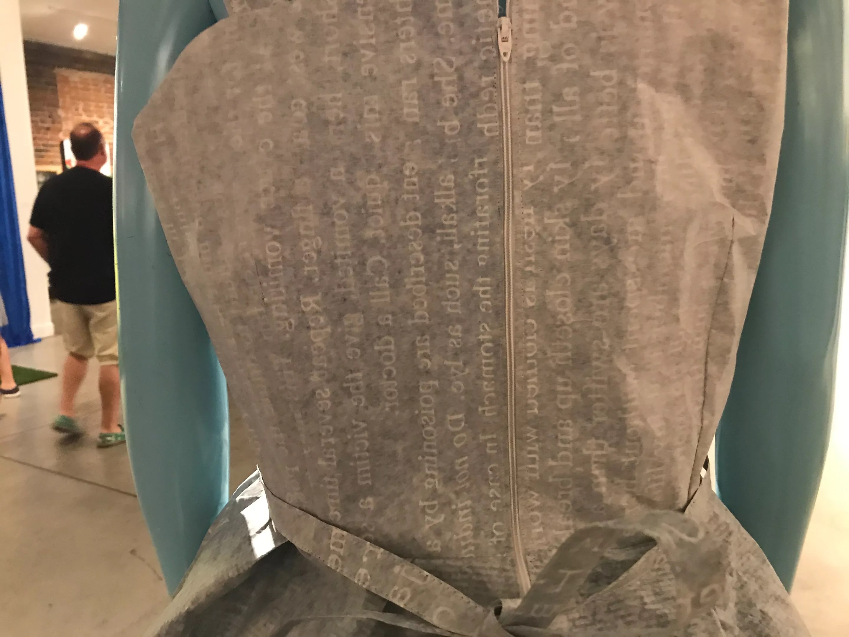 She’s best known for dresses with dark blue text culled from family documents such as medical records or immigration papers. But this year, with a piece titled For Me to Know, she turned those materials inside out, making the words difficult to read.