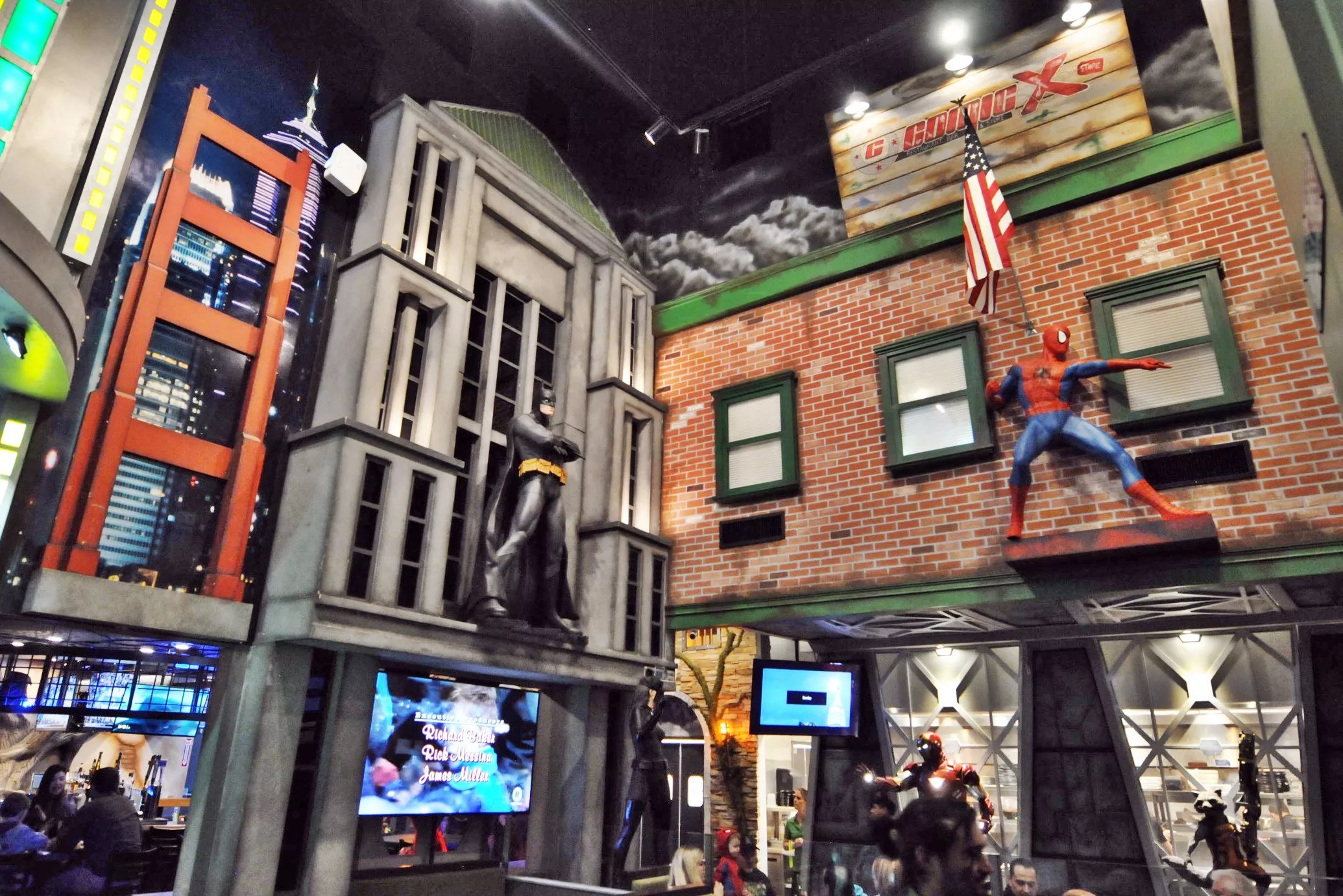 Walk inside the front doors and get ready to geek out. You’ll be greeted by the first of many life-sized statues of legendary comic book characters. Batman and Spider-Man are perched overhead on the side of skyscrapers in a two-story city scene that are straight out of a comic book.