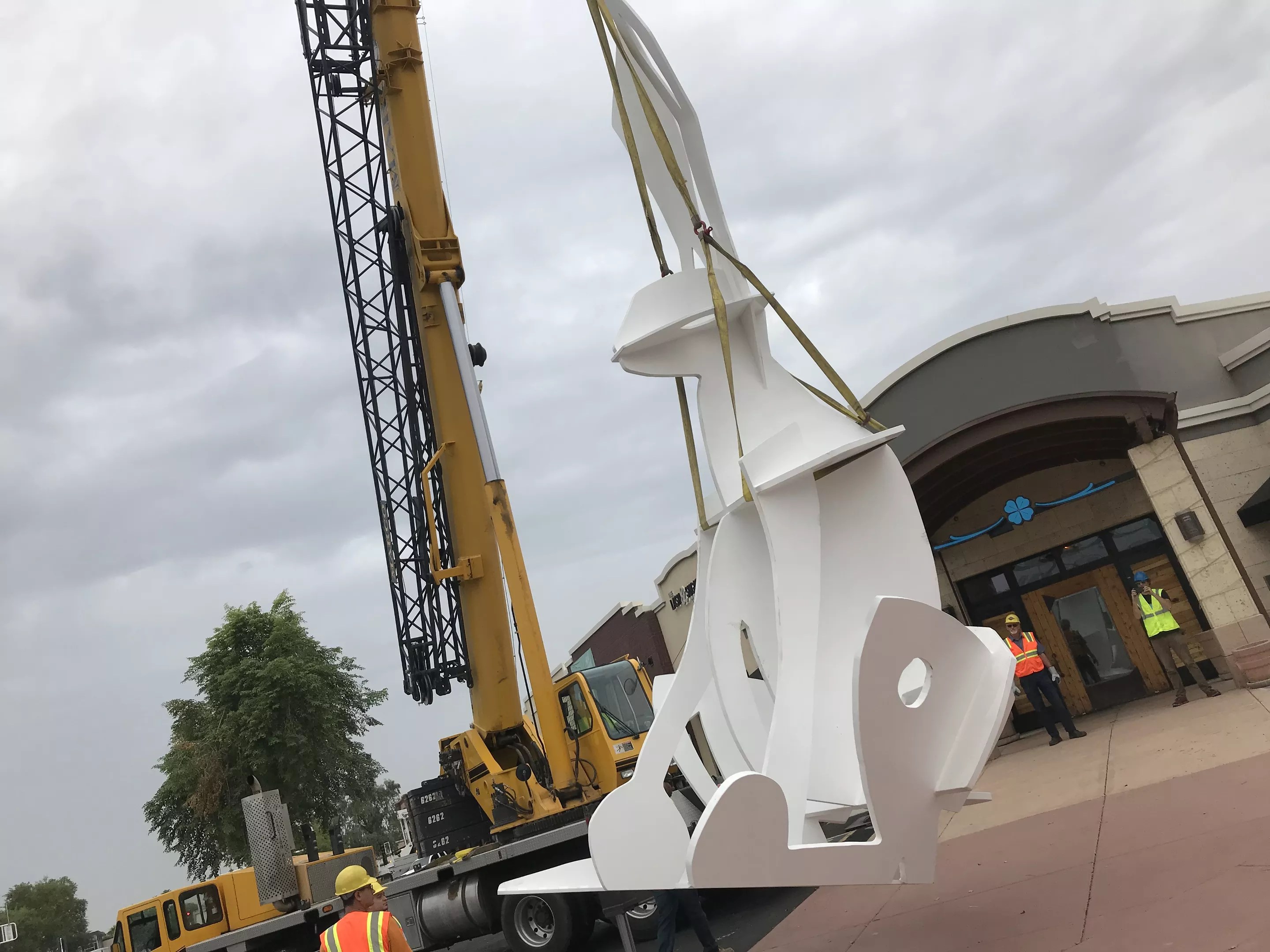 In the end, they went directly to the city council, which has the power to overrule the design board. In February, all but one city council member voted to approve the design, which meant the project could finally move forward. The concrete platform underneath the sculpture went in during August, then cured for several weeks before the rabbit was installed atop it.