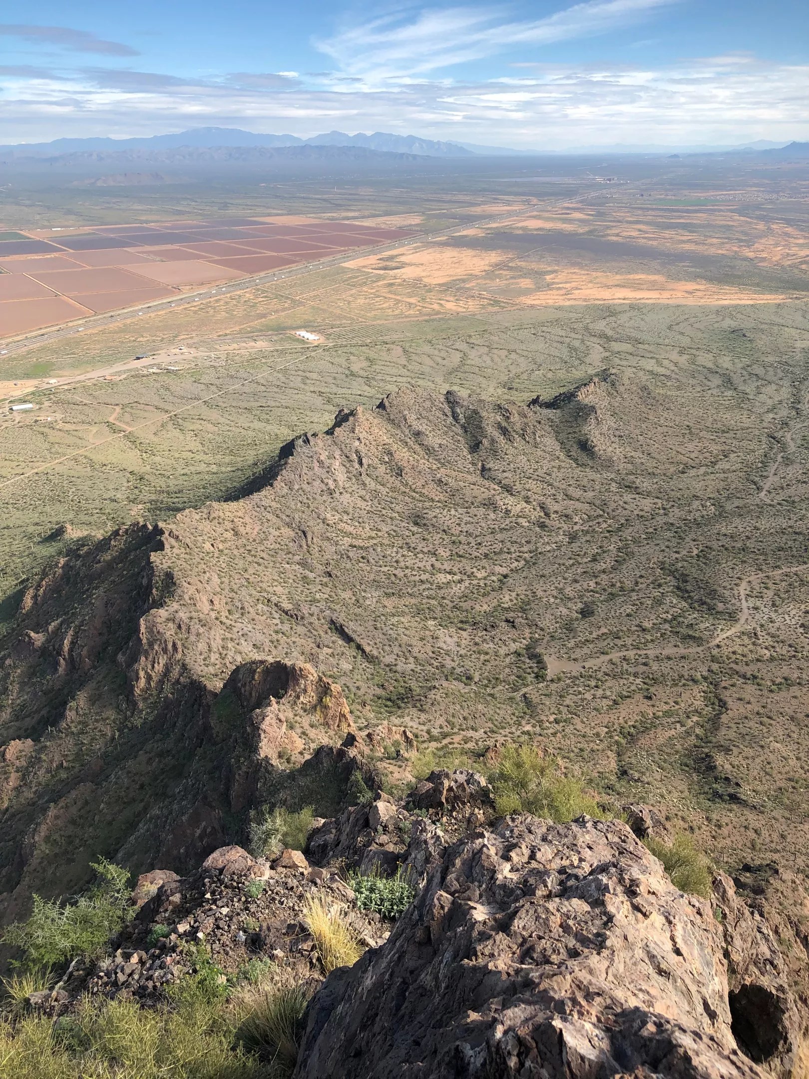 I’m always ready to be done once the scrambly sections are finished, but another few hundred vertical feet of trail remain to be traversed. I love the view from this summit. It’s a pointy, high peak with a relatively small summit space, which means incredible 360-degree views. On this clear day, I can see perhaps 40 or 50 miles across the pristine desert of the Ironwood Forest National Monument to the mountainous southern horizon. Seeing the I-10 like this is another treat, after driving it. This is one of the views that make me know why I love Arizona. To the northeast are more mountains of the Picacho range, with their high point of Newman Peak (a longer hike, but on my bucket list).