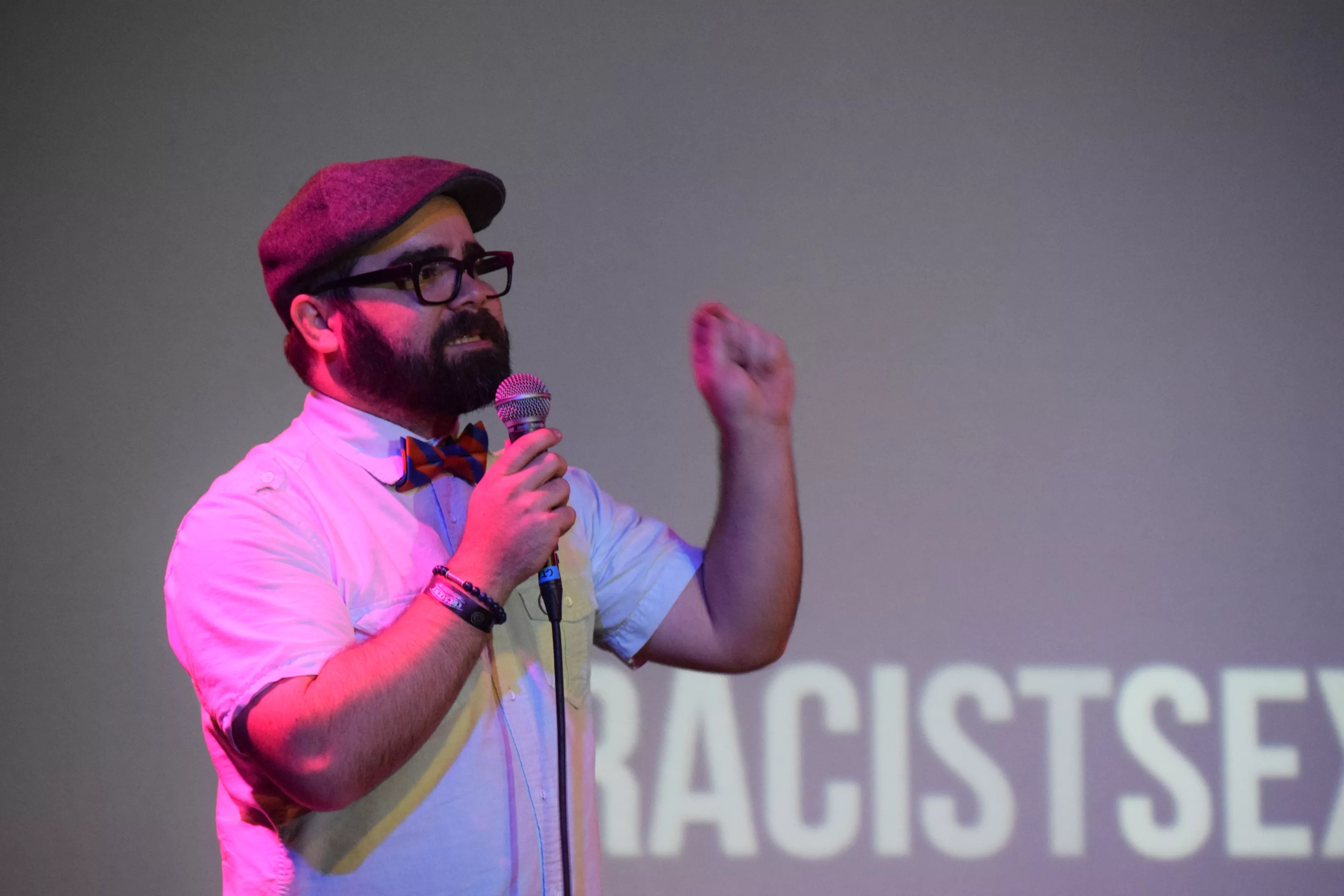 Filmmaker Matty Steinkamp speaks during a screening for You Racist, Sexist, Bigot.