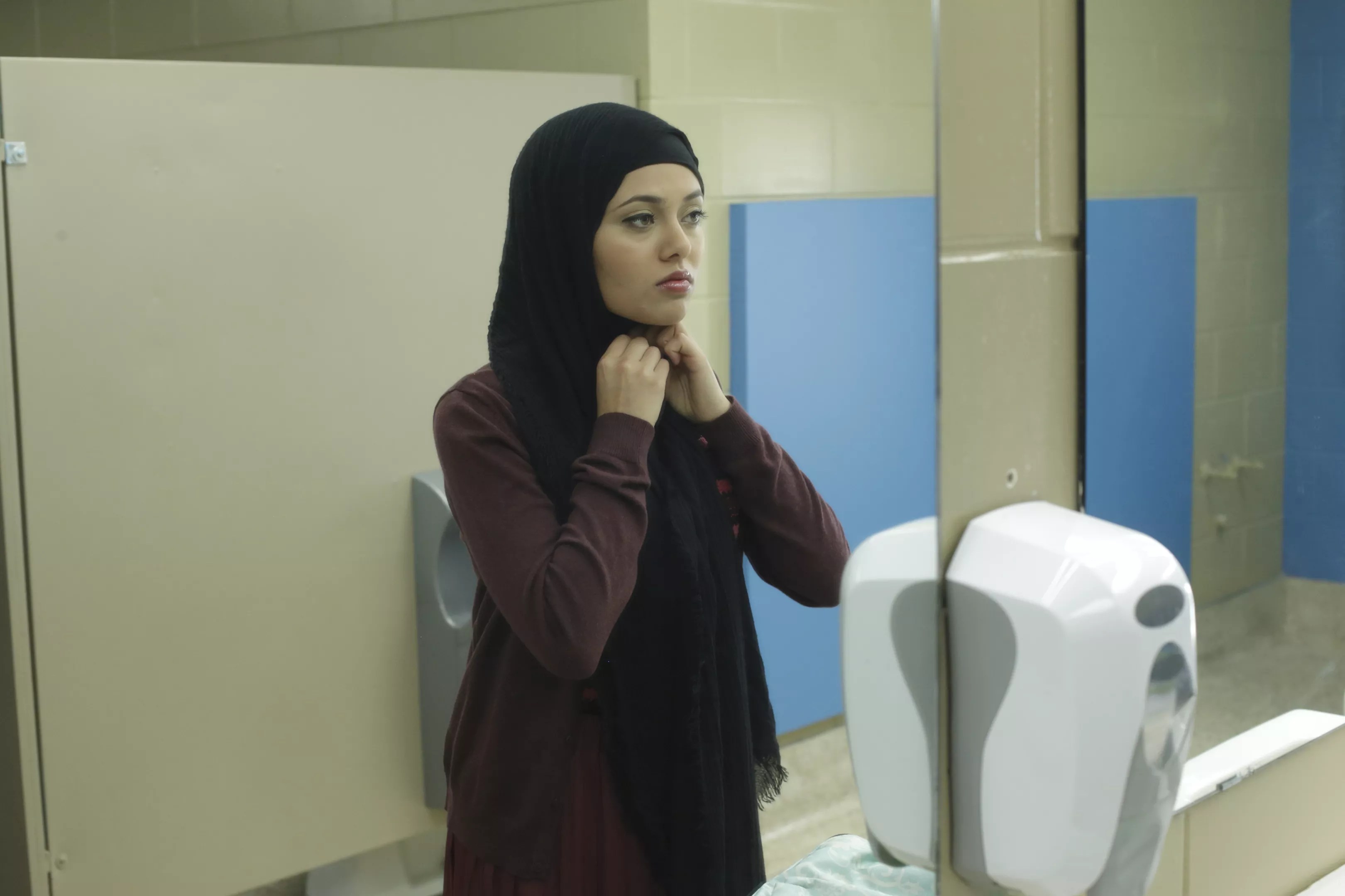Later at school, Goldi looks at herself in the bathroom mirror and starts removing her hijab. She lowers her ponytail and walks out into the hall, uncovered. At first, it feels like a slow-motion victory, but then, she freezes. She runs quickly back into the bathroom and puts it back on. She arrives to class late, where Mr. Perino points out that she’s just in time to talk about immigration. “How long have you lived here?” he asks. Taken aback, she replies, “My whole life.” She asks if he thinks brown people can’t be from here, or at least Muslims. When he calls it a “mistake,” she asks if it’s a “mistake” that people ask if she’s bald under her hijab. Or, is it a “mistake” that people assume she knows about suicide bombers? There are 1.6 billion Muslims in the world and everyone is different. He apologizes and she accepts.
