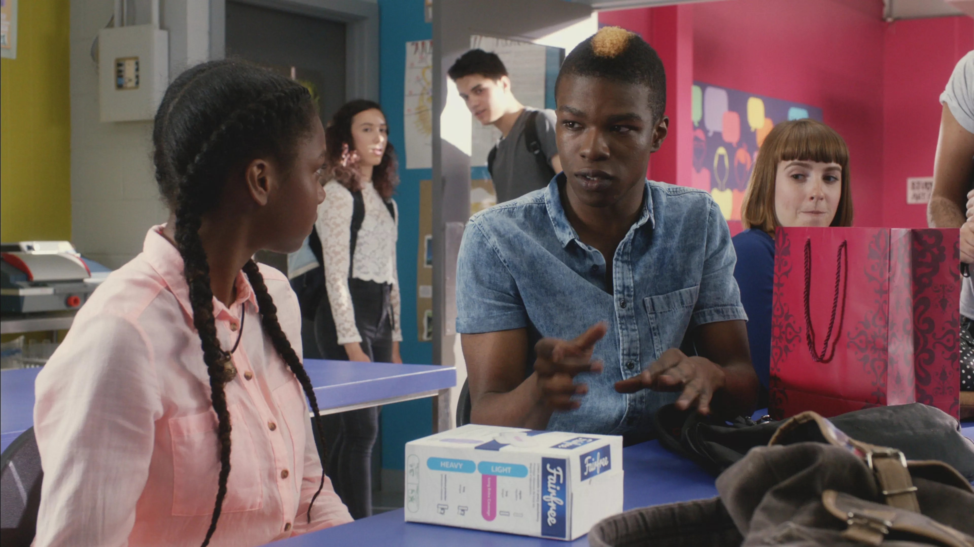 The next day, she gets to class, where Tiny is waiting. She sheepishly sits down, apologizing for what happened to his pants. He shrugs it off, instead presenting her with a pink gift bag. She discovers two giant boxes, one with tampons and one with pads. When she understandably freaks out, he truly doesn’t know what he did wrong, explaining that he had talked to Esme, who told him that’s what he should do. We told you she was up to some evil this episode. However, we get that he’s a teenage boy, but he should have some clue that it’s a bad idea, right? From like, watching TV and stuff, maybe? Shay runs off mortified, and when she confronts Esme, she retorts, “Wow, someone’s prepared. That’s what I’ve always liked about you, Shay. Always willing to go with the flow.” Fine, Esme, well played on the period puns, but just this once!