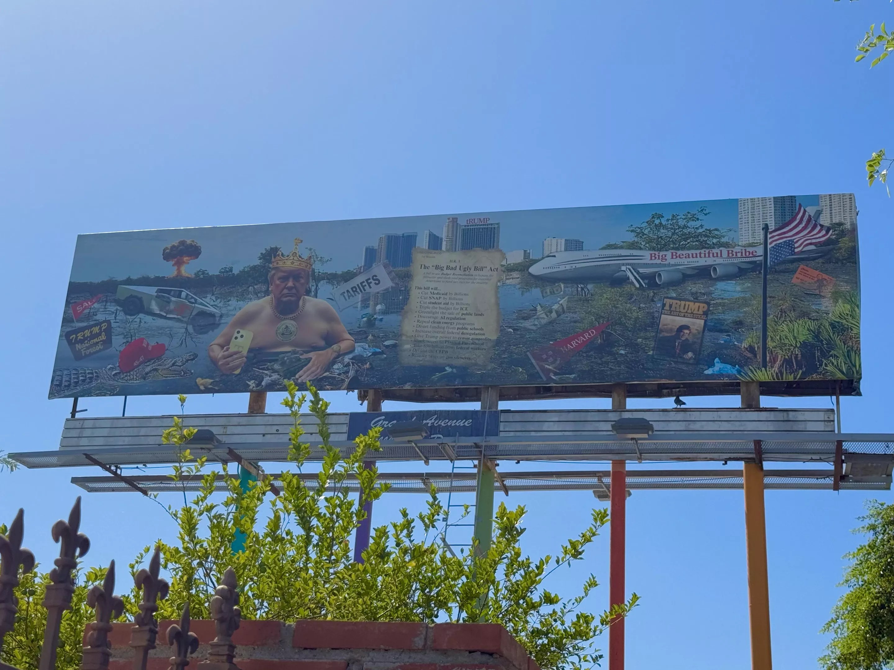 Since Trump’s second term in office began in January, it’s been months of erratic and contradictory policies, which Fiorito aimed to capture. The billboard reflects the chaos with a maximalist composition depicting a naked Trump wearing a golden crown, surrounded by representations of his failures and missteps. He rules over the swamp that he said he’d clean up, but only made stinkier.