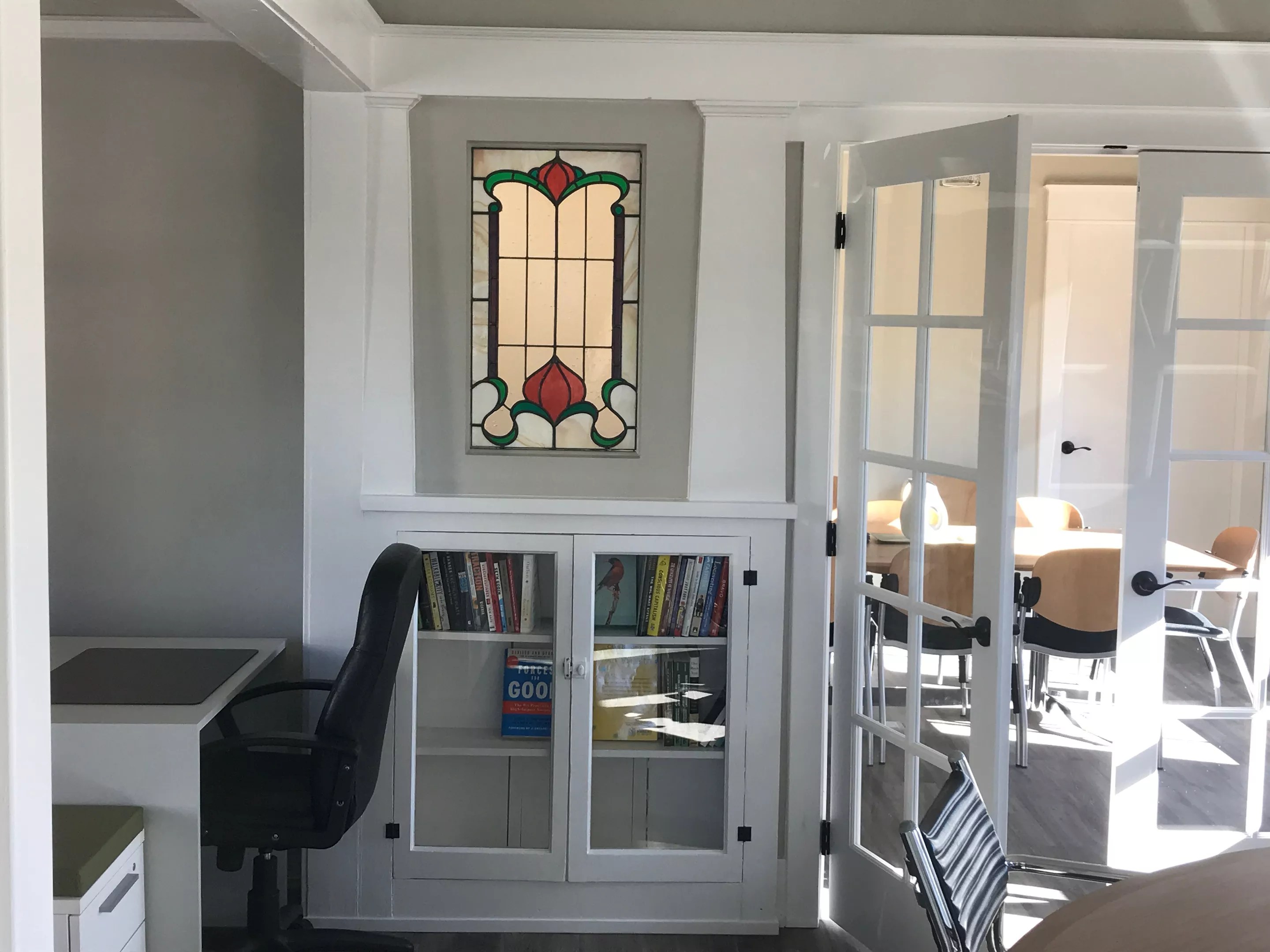 When Lanning moved the house to its current location, she figured renovations would take 12 to 18 months. Instead, it took 2 1/2 years. Renovations included plumbing and electrical work, and replacing elements such as drywall and broken windows. Interior highlights include a pair of original stained glass windows. Lanning also had a wraparound porch added to the building, which now has its own courtyard.