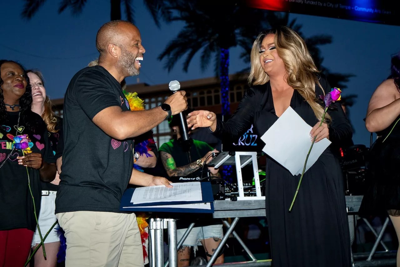 Tempe Mayor Corey Woods, left, delivers a mayoral proclamation declaring the month of June to officially be recognized as Pride Month in the city of Tempe.