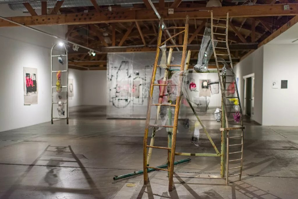 For another work, Levinson renders elevator numbers, knowing that several women died trying to escape through an elevator shaft. Others died attempting to climb down a fire escape, something Levinson conveys with a mixed media sculpture including a pair of ladders.