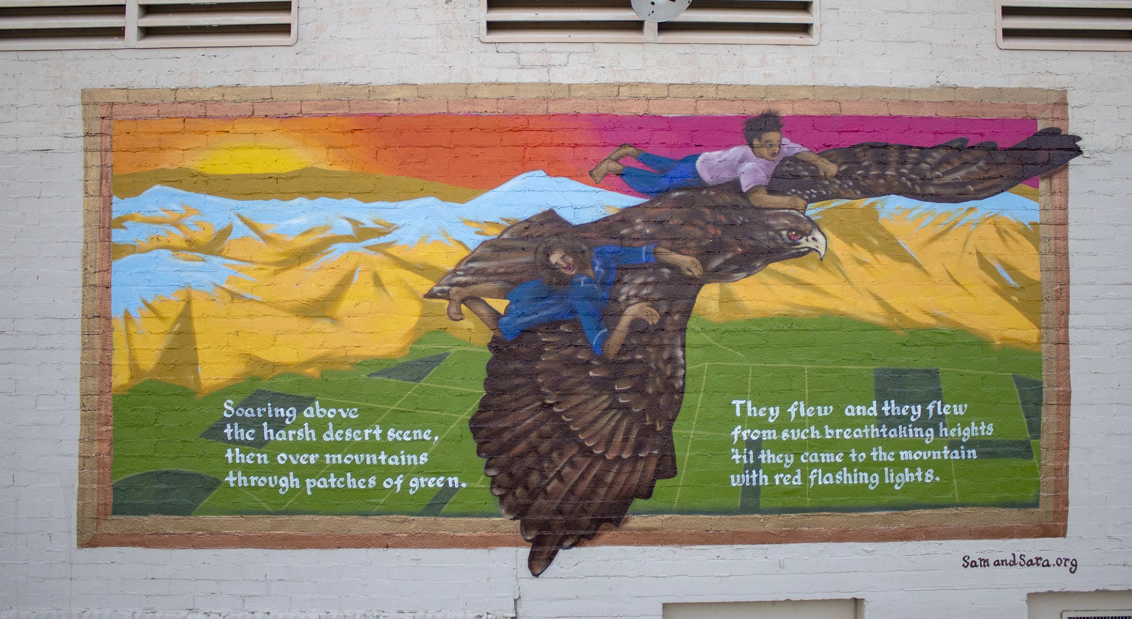 A mural in Ajo depicts the main characters of “Sam and Sara” riding atop a hawk.