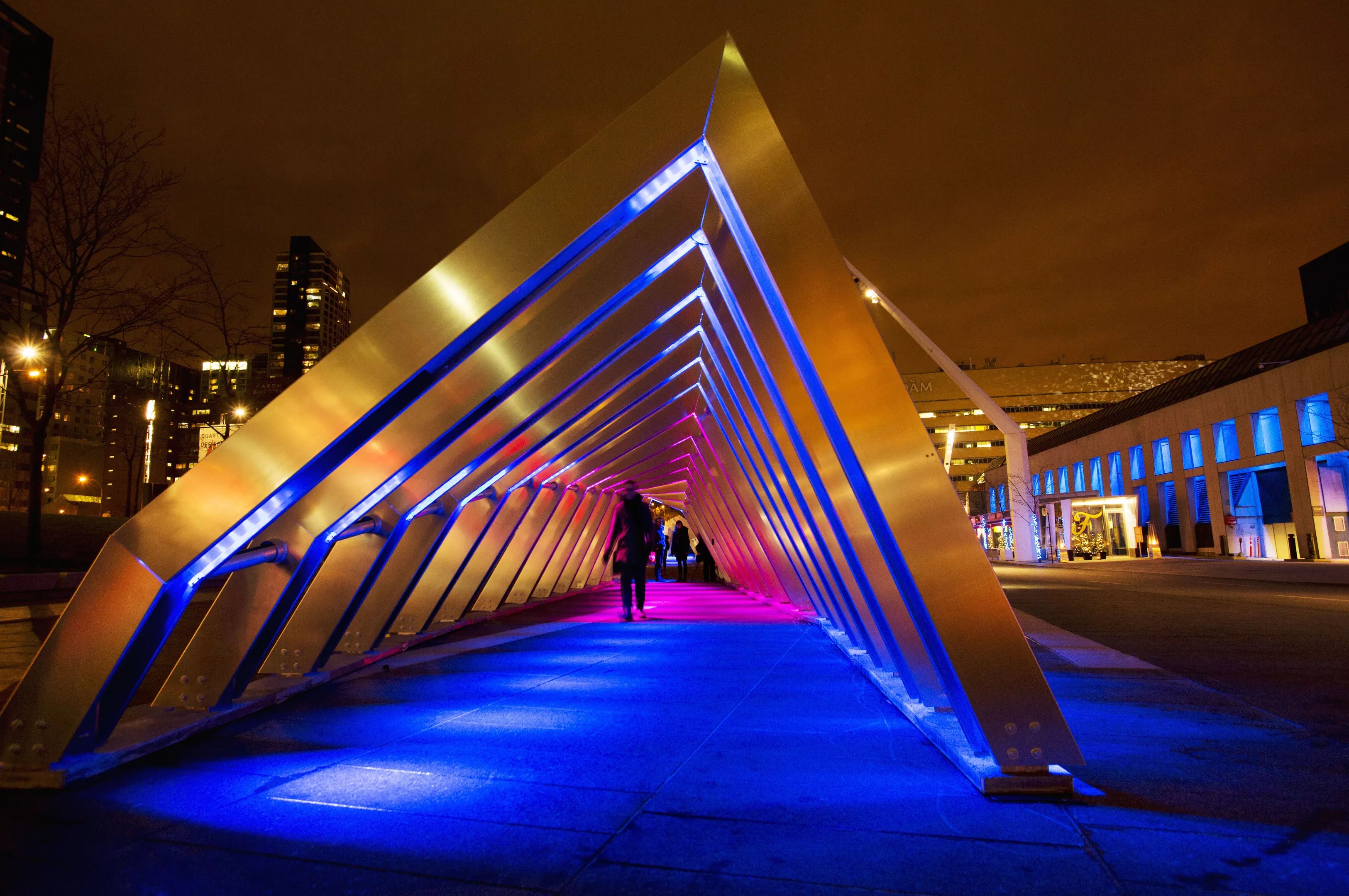 Montreal-based ATOMIC3 and APPAREIL Architecture are showing a work meant to reflect the lifespan of an iceberg, from its creation to eventual melting. Created in collaboration with Jean-Sébastien Côté and Philippe Jean, it’s a series of 14 illuminated metal arches arranged to form a tunnel. When people pass through each arch, it activates variations of light and sound. The piece was originally created for the Montréal en Lumière festival.